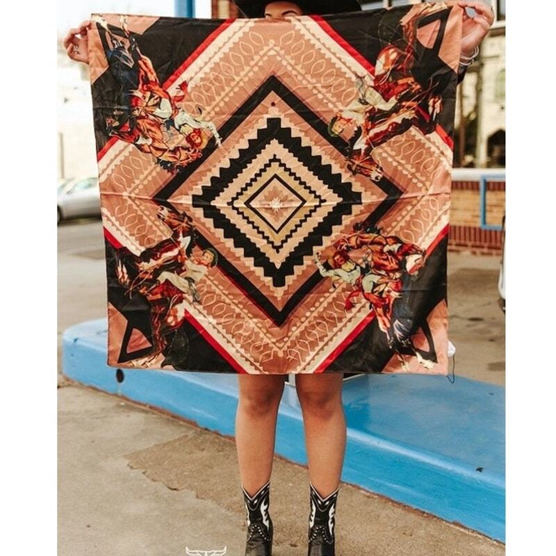 This bold western wild rag features dynamic vintage rodeo artwork framed by layered Southwestern diamond geometry for a powerful, statement-making design. Illustrated cowboys in motion anchor each corner, bringing authentic western energy and movement to the piece, while warm neutrals of tan, saddle brown, black, and touches of red create depth and contrast. The center diamond motif adds a classic Southwest feel that pairs effortlessly with cowgirl apparel, rodeo looks, and western accessories. Crafted from a lightweight, silky fabric, this wild rag offers a smooth drape and versatile styling-perfect for wearing around the neck, tying on a hat, or adding flair to handbags and belts.