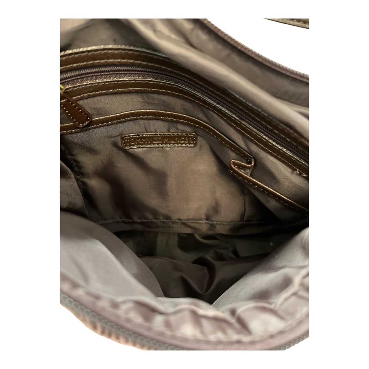 Stylish vintage Tommy Hilfiger shoulder bag featuring a rich brown patchwork design combining corduroy, suede, and textured fabric panels. Finished with leather trim, brass-tone hardware, and signature ring details engraved with the brand name. Slouchy hobo silhouette with a comfortable shoulder strap and roomy interior, perfect for everyday use or vintage fashion styling.