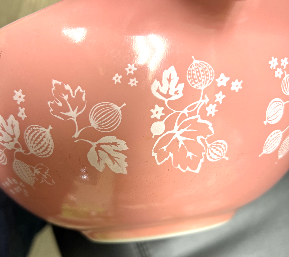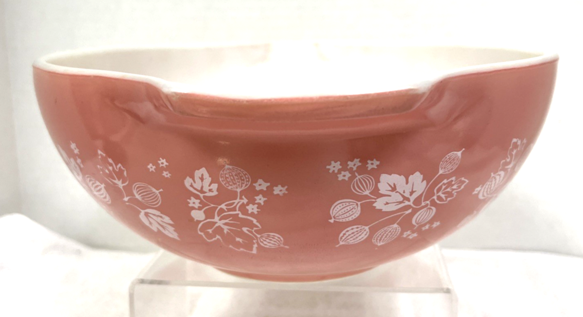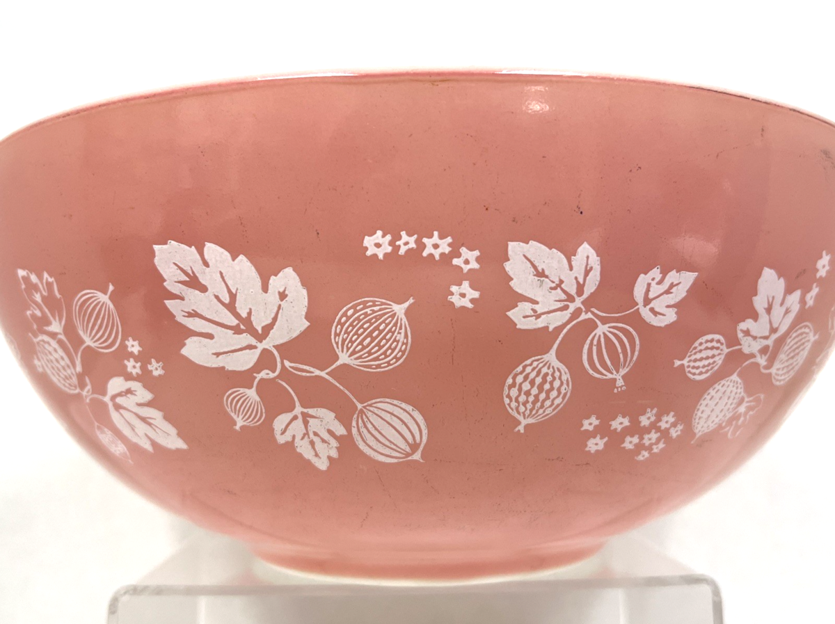 Vintage Pyrex Pink White Gooseberry Design Cinderella Nesting Bowl 4 Quart. Good used condition pink background white gooseberry design Pyrex bowl, measures approx. 13" wide - tab handle to tab handle end and 4 3/8" tall/deep. No damage, inside tab handles light staining, outside of bowl has surface scratches, signs of use inside bottom. See pictures.