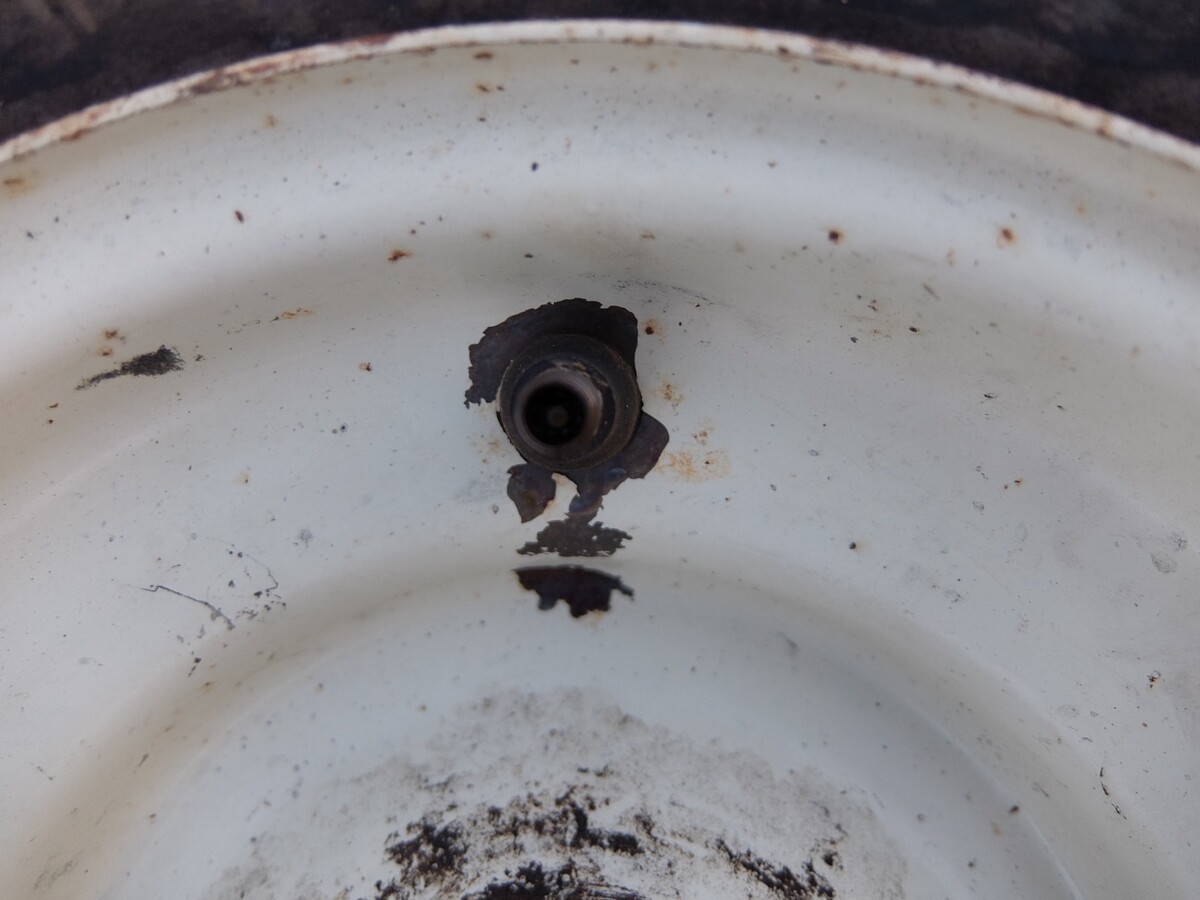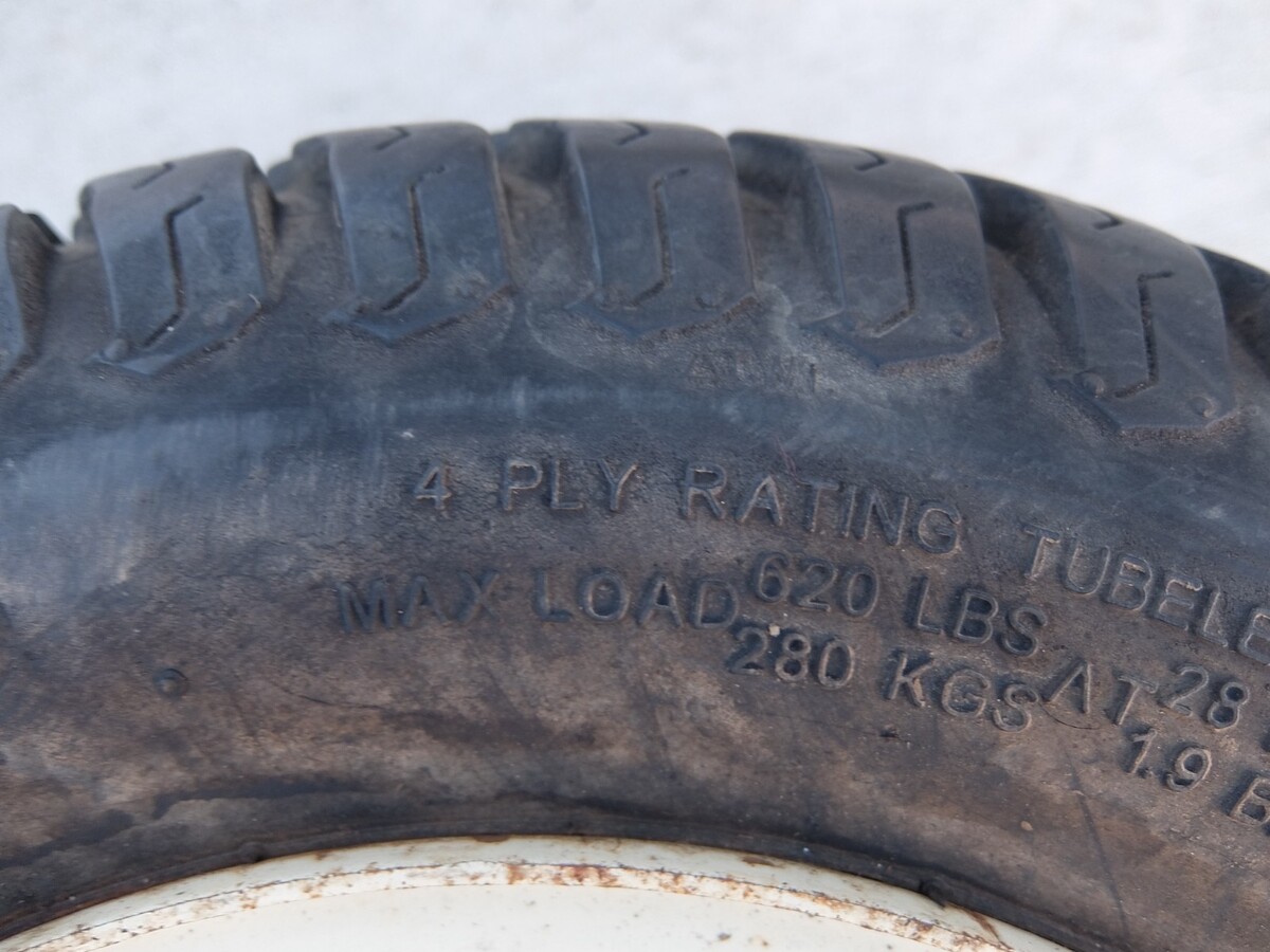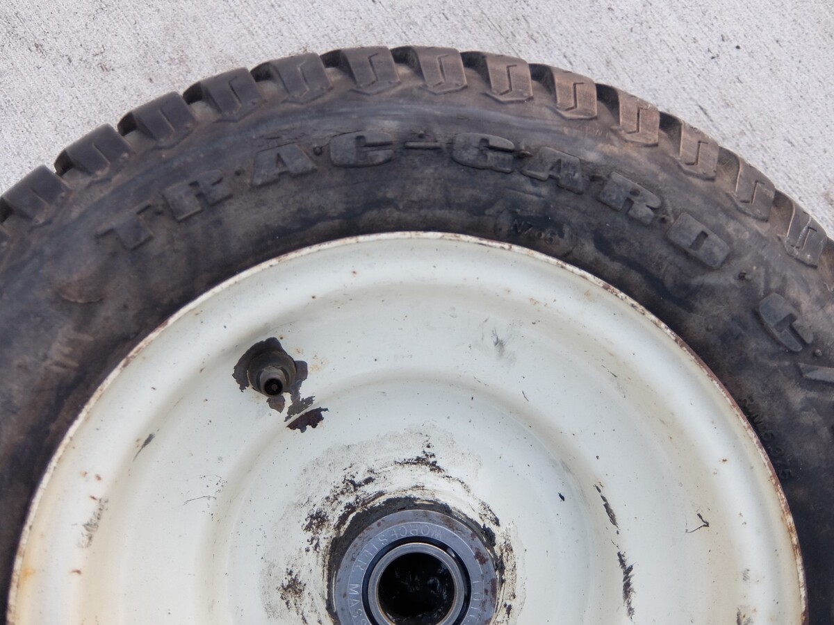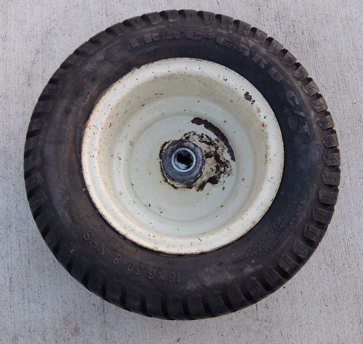 This is a used front wheel and tire assembly that was removed from the tractor below. The tire is a Turf-Gard 16x6.50-8. It has about 90% tread. The bearings fit a 1" axle. Note that the wheel shows some sprinkled light rust spots, peeling paint, and grease stains befitting a used part. The tire is tubeless but seems to hold air fine. We think it makes a good spare tire.