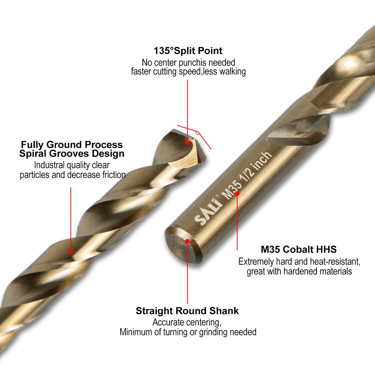 SALI 5Pcs 1/2" M35 Cobalt HSS Jobber Length Drill Bit Set for Metal