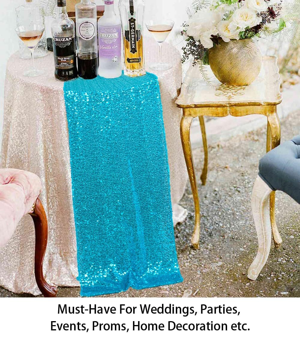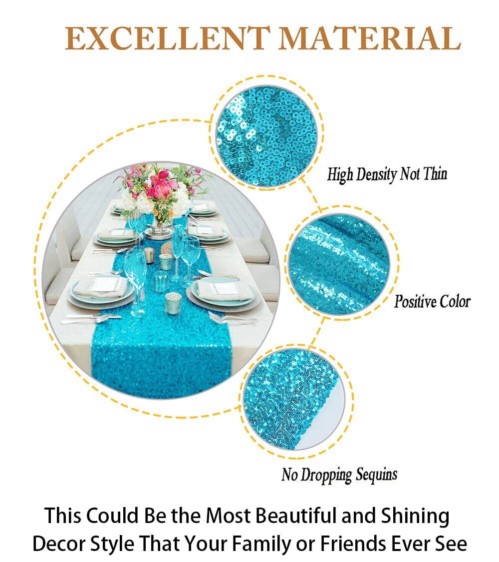 DiningTable Runner: 10pc 12x72-inch Turquoise sequin table runner. This rectangle table runner can fit a 4ft rectangular table or round table well. This sparkly table cover is great for event table decorations.,Sequin Table Runner: Made of glitter sequin fabric,countless sparkle sequins on mesh fabric, the table runners are not easily see through.,Outdoor table runner: This glitter table covers are well made by skillful craftsmen. All the edges of the glitz table runners are well finished. It's normal for a few sequins fall off. Please shake the sequin table runner a little before use.,Living Room Table Runner: Our sparkle table runners are designed for a variety of happy occasions: suitable for your dining-room table, kitchen table, Cafes, restaurants, diners, catering, weddings, brunches, buffets, parties, picnics, outdoor patio table.,Care Instruction of Party Table Runner: This sparkle table runner can be washed by hands in cold water,and hang to dry. Sequin table runners are durable and can be used again and again.
