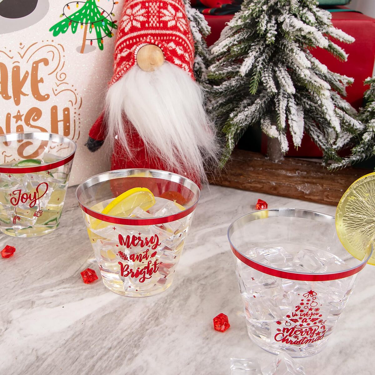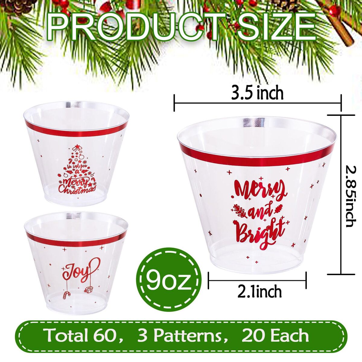 Reliable Quality: The Christmas plastic cups are made of food grade plastic material and safe, the excellent material makes them not easy to break.,Suitable Volume: The capacity of each red plastic cups are about 9 oz, enough to hold most drinks, such as soft drinks, juice, beer, cocktails, etc. There are 20 count of each patterns. The perfect choice for a Christmas party decoration!,Stylish Design: Guests will be enchanted by our elegant Christmas cups with exquisite three patterns, and these Christmas disposable cups can add a sense of sophistication to your Christmas party and family.,Easy To Organize: When you're done with these red rim plastic cups, you can throw them in the trash so you don't have to clean up after a busy dinner or party. Reduces time spent cleaning and washing dishes, making life more comfortable.,Satisfaction Guaranteed: We are sure that both you and your guests will love the Christmas party cups.However, if you have any questions after receiving the package, you can contact us and we will give the most satisfactory solution for you.