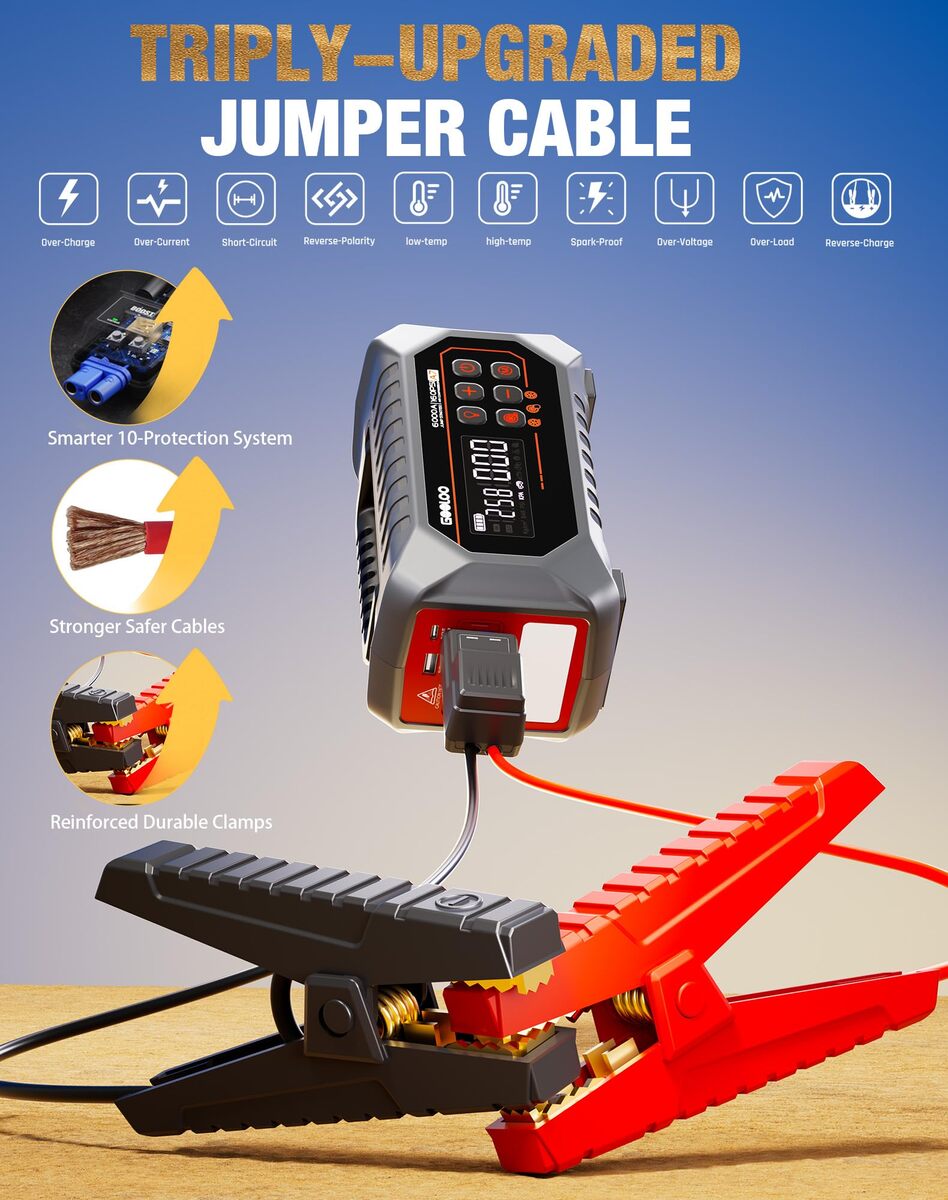 12-IN-1 Jump Starter with Air Compressor: GOOLOO A7 battery jumper starter portable packs 12 vital functions: Jump Starter, Tire Inflator with Pressure Gauge, Air Injection/Extraction, Ball Pump, 30W Fast Charging, LED/Warning/SOS Lights, "BOOST" Function and Power Bank. It's versatile, powerful, and ensures you're equipped for any situation.,Real 6000A Car Battery Jump Starter: This battery booster can instantly revive dead batteries in cars, trucks, SUVs, RVs, and even up to 10L diesel engines. If your battery is completely drained, simply press the "BOOST" button for an extra-strong jump start, ensuring reliability when you need it most.,Inflate Deflate Air Pump: Designed for high-efficiency inflation, this car jump starter with an air compressor is easy to carry and features dual-mode versatility. The jump pack with air compressor excels at inflating heavy-duty vehicles quickly, such as pickups, trucks, and off-road vehicles. It efficiently inflates an SUV tire (e.g., 315/70R17) from 0 to 35 PSI in about 14 minutes. Additionally, the blower rapidly inflates larger items like air sofas, pool floats, inflatable tents, and air boats in just minutes.,Only 3 Steps to Go: A7 jump box with air compressor designed for ultimate ease of use, featuring 3 intuitive steps for every core function. Get going in no time: 1. Jump-Start (Clamp cables, Connect, Crank engine). 2. Tire Inflation (Attach hose, Set PSI, Inflate). 3. Blower Mode (Attach hose, Secure nozzle, Activate). Simple, fast, and hassle-free.,Built for Emergencies Adventure: Ready for any climate (-20C to 60C), this car jump starter with air compressor solves roadside troubles like dead batteries and flat tires, and handles outdoor inflating needs for tents, mattresses, and pools. Smart auto-mode ensures top performance for every task?perfect for travel and camping.,18-Month Warranty: We back the GOOLOO A7 tire inflator portable air compressor with a 50% longer, industry-leading 18-month warranty. Package includes: Jump Starter, Smart Cables, USB-A to USB-C Cable, Air Hose, Blower Tube, 5*Air Nozzles, and 5*Blower Nozzles.