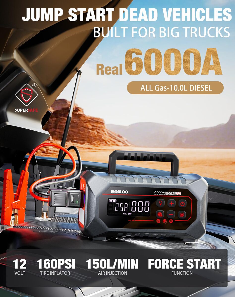 GOOLOO A7 Jump Starter 6000A 160PSI w/Air Compressor 12V Car Battery Jumper
