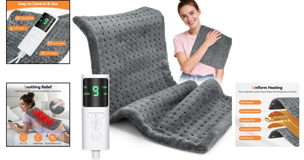 Luxury Electric Heating Pad - 12x24 for Neck, Back & Cramps - 4 Timers Included