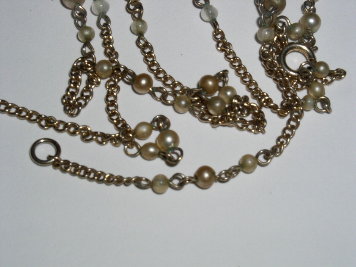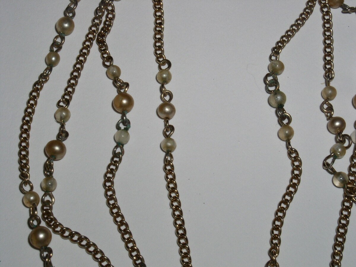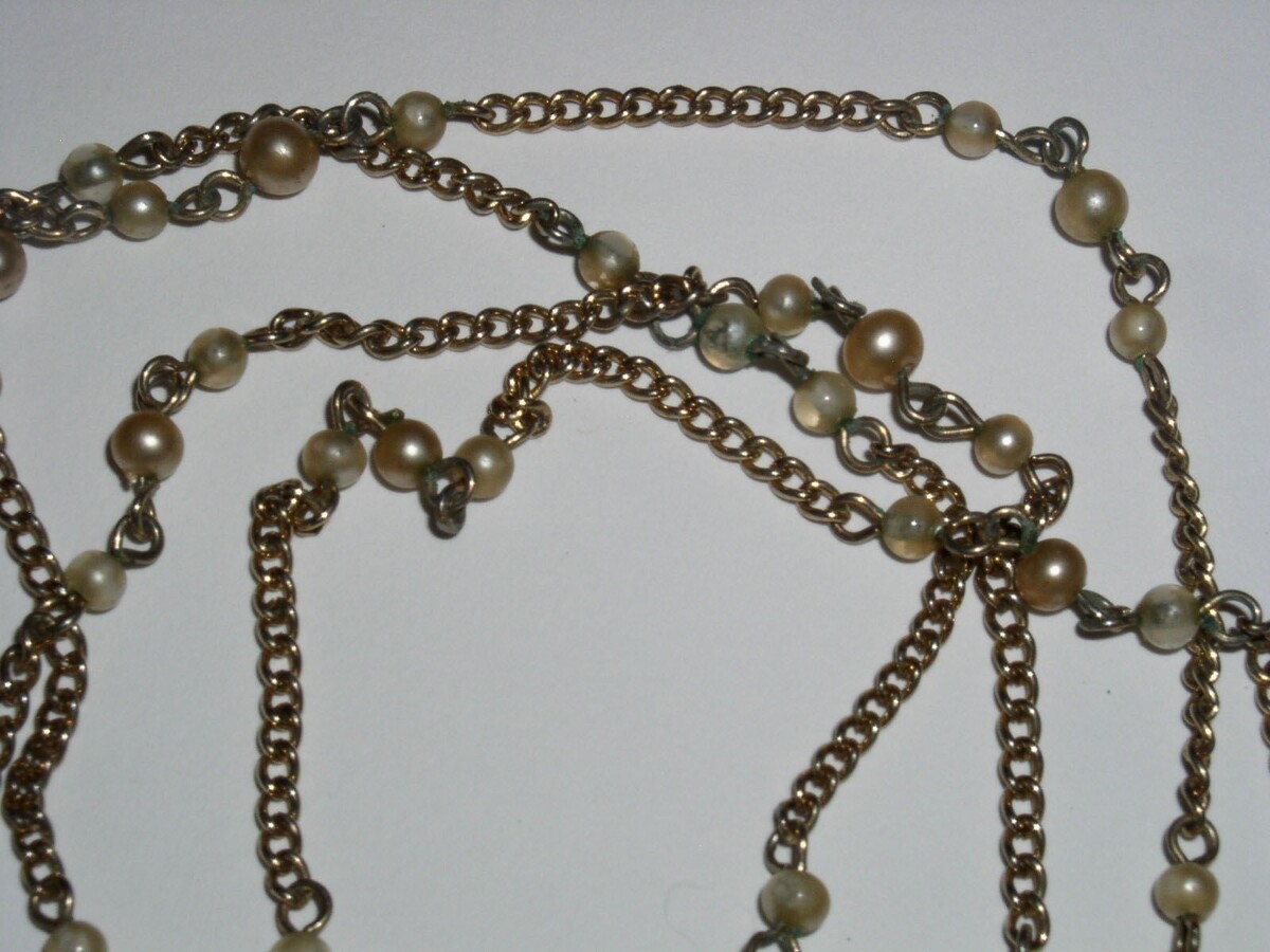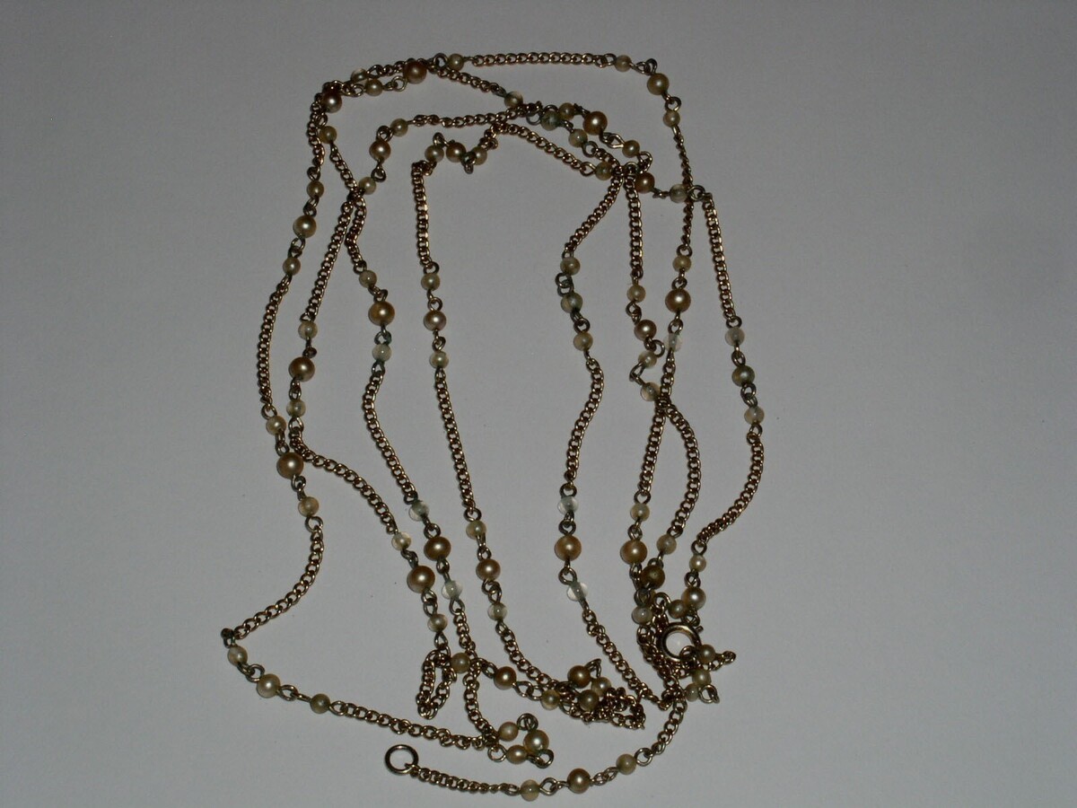 This is a vintage gold-tone chain necklace with faux pearl accents as shown. Measures approximately 58" long. Pearls measure a very small 1/16" in diameter. Most likely would want to double or triple it. Spring ring clasp.