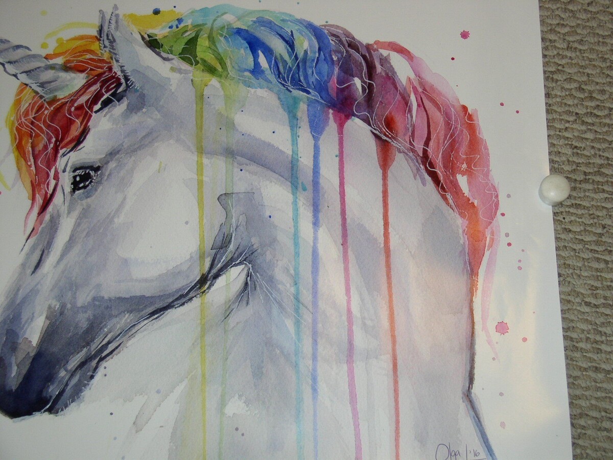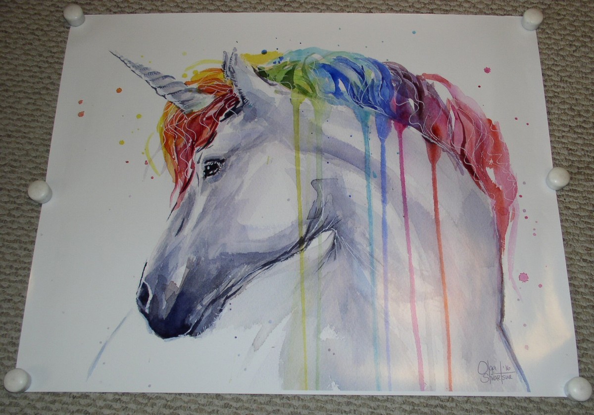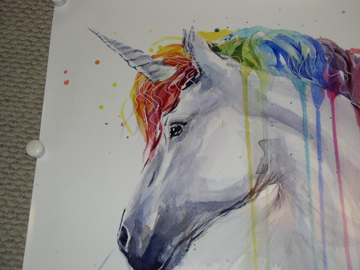 This is a 23 1/4 X 29 Unicorn watercolor poster print. Artwork by Olga Shvartsur. Printed on a heavy paper.