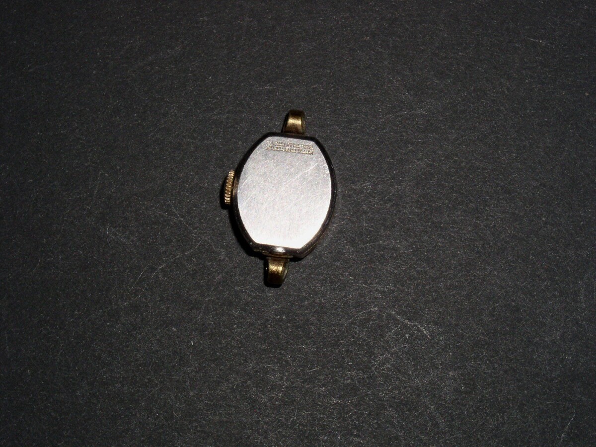 This is vintage Sovereign watch. No band with this. Marked 17 jewels. Back reads: Base metal bezel, stainless st back. It is not in working condition. There is no crystal covering. Sold as-is. Measures 3/8" wide including the stem.