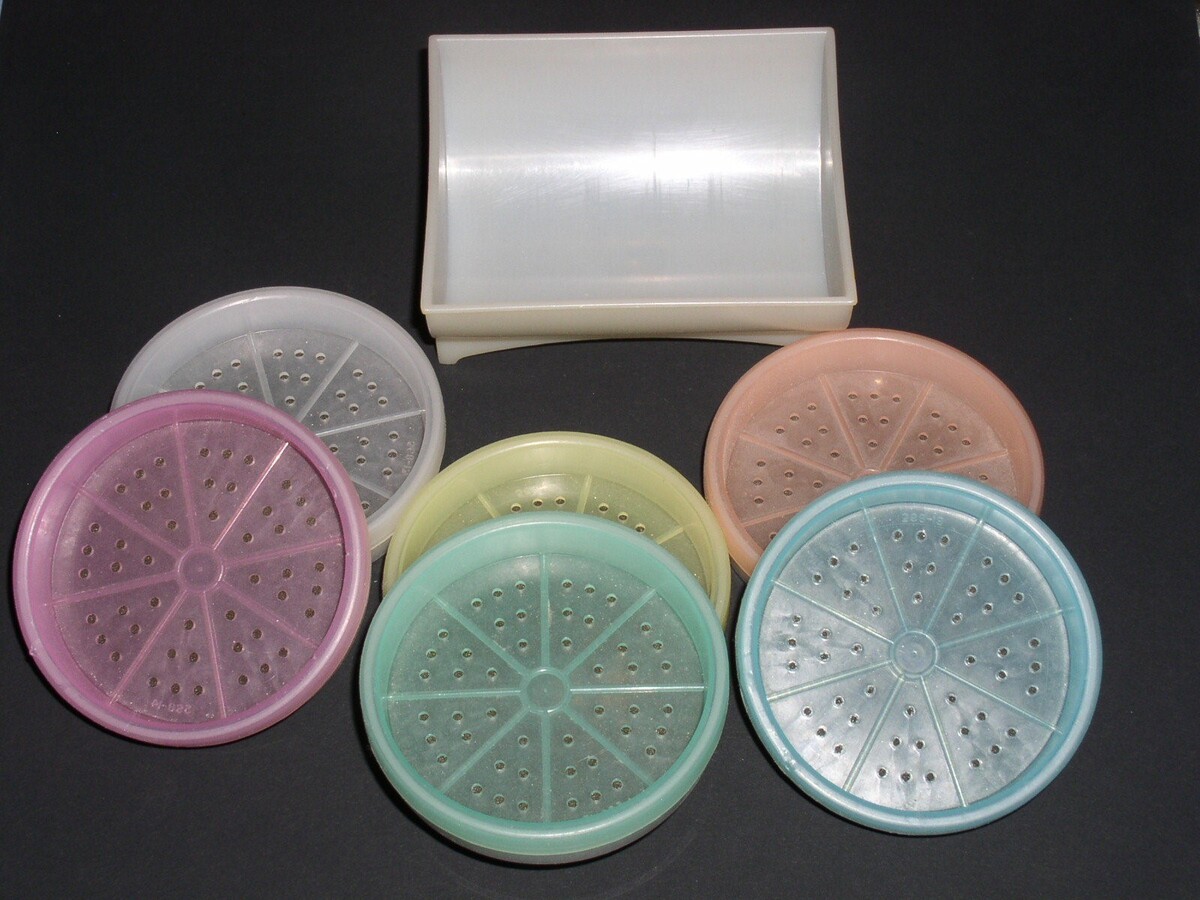 This is complete set of six, Tupperware Wagon Wheel coasters. Comes with the original caddy as shown. Undated, the catalog number is 567-15.