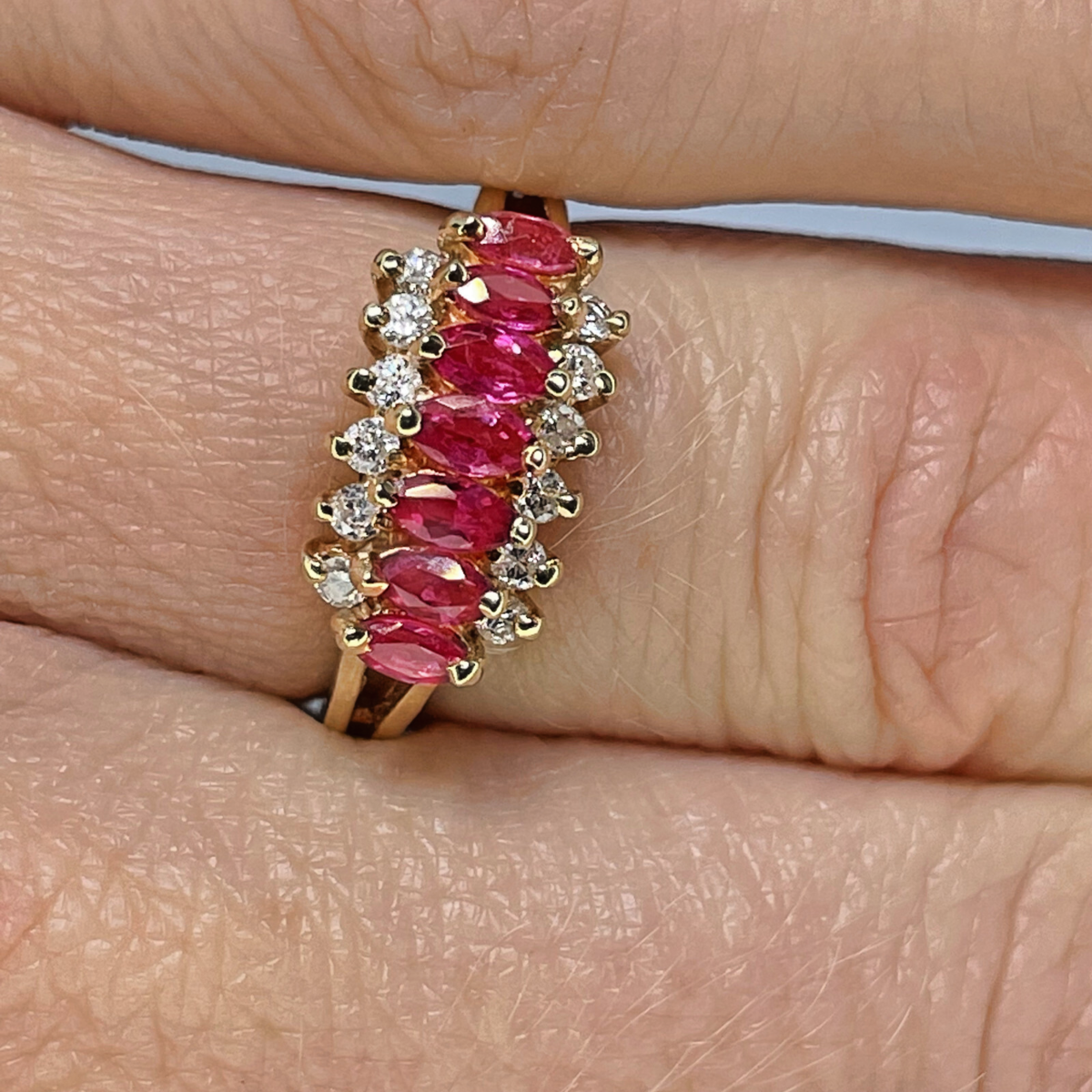 This ruby and diamond band measures approximately 5/16" long down the finger and has a low profile of just 1/4" rise off the finger making it perfect as an everyday ring (7.5mm, 5.6mm).