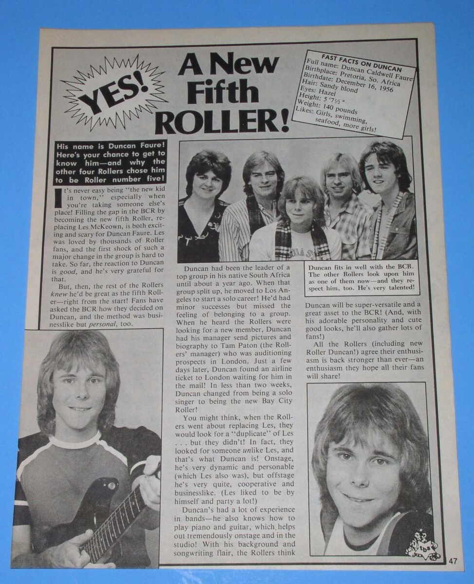 This is a vintage photo + short on Duncan Faure of The Bay City Rollers, clipped from the March 1979 issue of "Tiger Beat Star" magazine. "A New Fifth Roller".