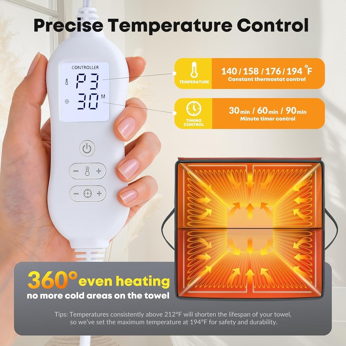 Adjustable Thermostat Timer: Customize your experience with temperature settings from 60C to 90C and select timers for 30, 60, or 90 minutes with auto shut-off for added peace of mind.