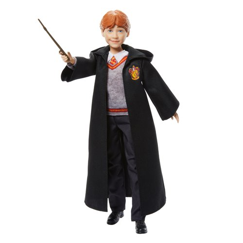The magic of the Harry Potter films comes to life with this true-to-movie Ron Weasley fashion doll! Ron wears his signature Hogwarts uniform ? removable robe, shirt, pants and shoes - featuring the Gryffindor crest and colors. As a friend of Harry's, adventures are sure to arise! Good thing Ron doll comes with his wand to discover the magic. Ron bends at the arms, head and legs so he's ready for endless play possibilities! Ages 6 and up!