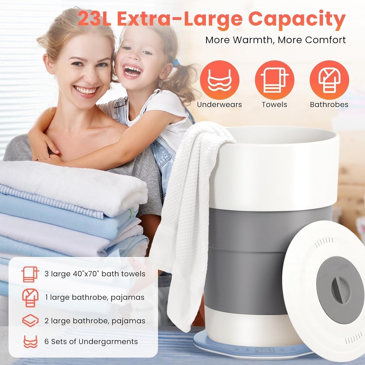 Large 23L Capacity: Accommodates two oversized bath towels (70 x 40 in / 177.8 x 101.6 cm) or approximately four medium-sized towels, bathrobes, and more.