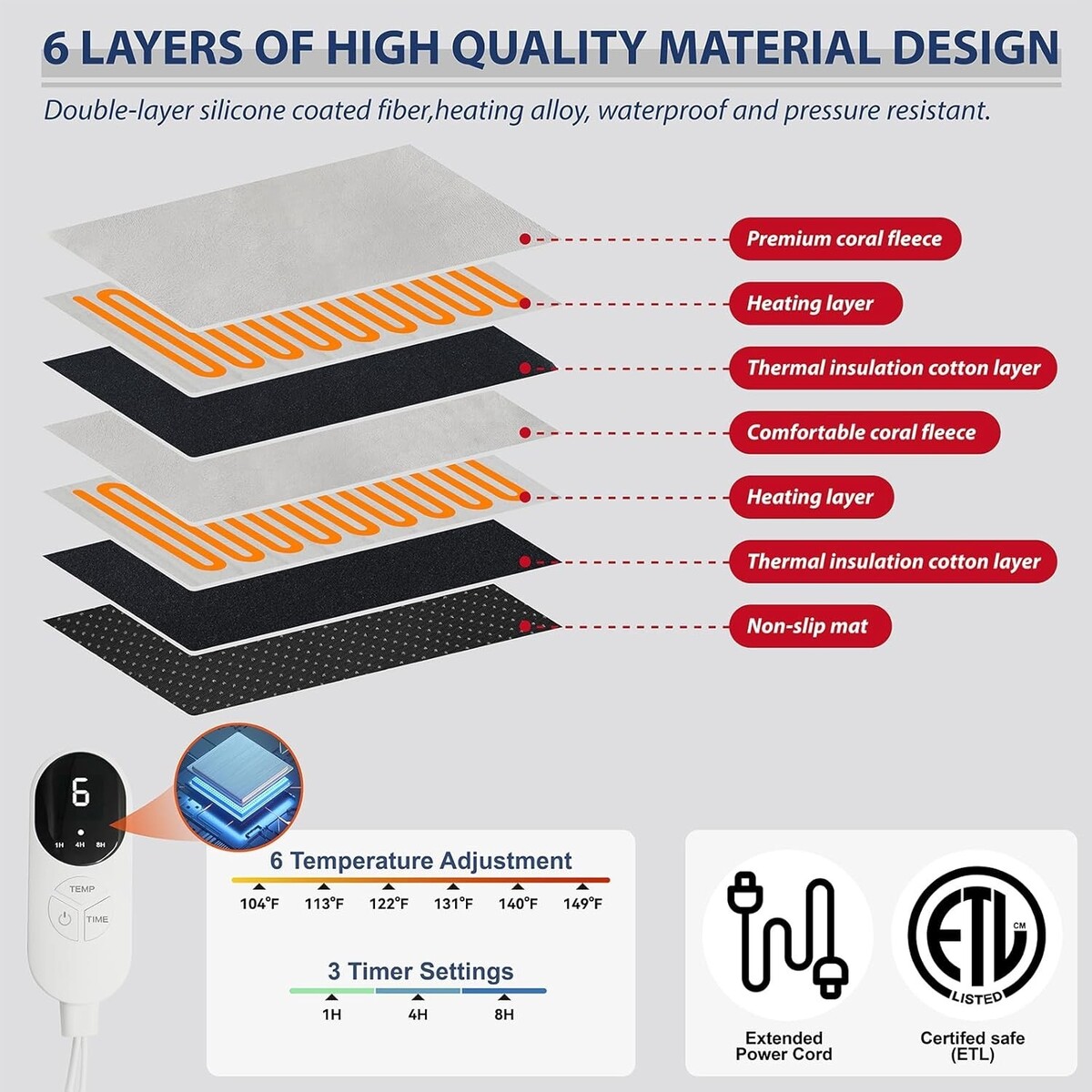 Convenient Timer Function: With 3 built-in time modes, set the pad to automatically turn off after 1, 4, or 8 hours for worry-free relaxation.
