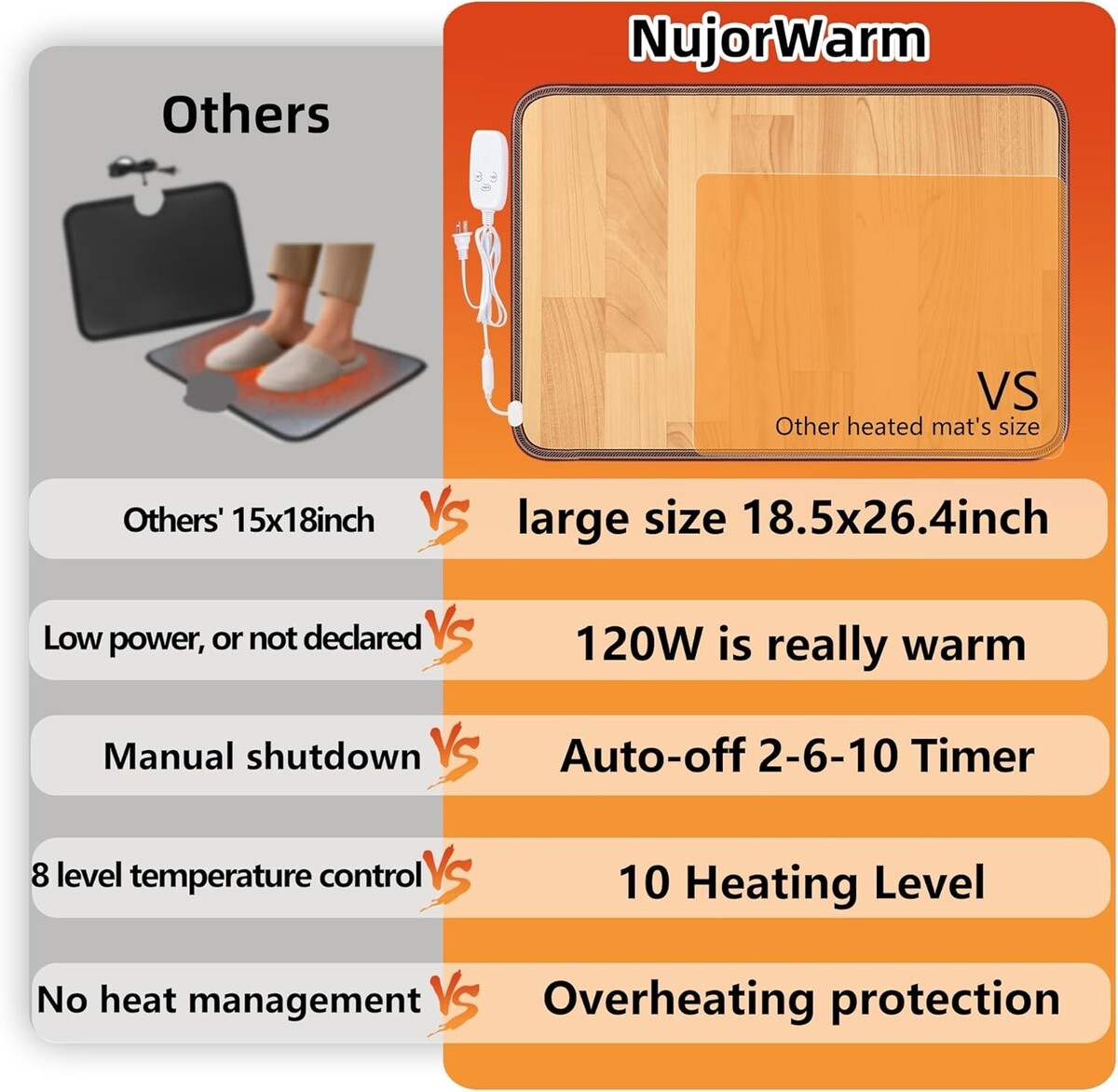10 Heat Levels Timer Options: Choose from 10 heating levels and three timer settings (2-6-10 hours) to tailor your warmth experience.