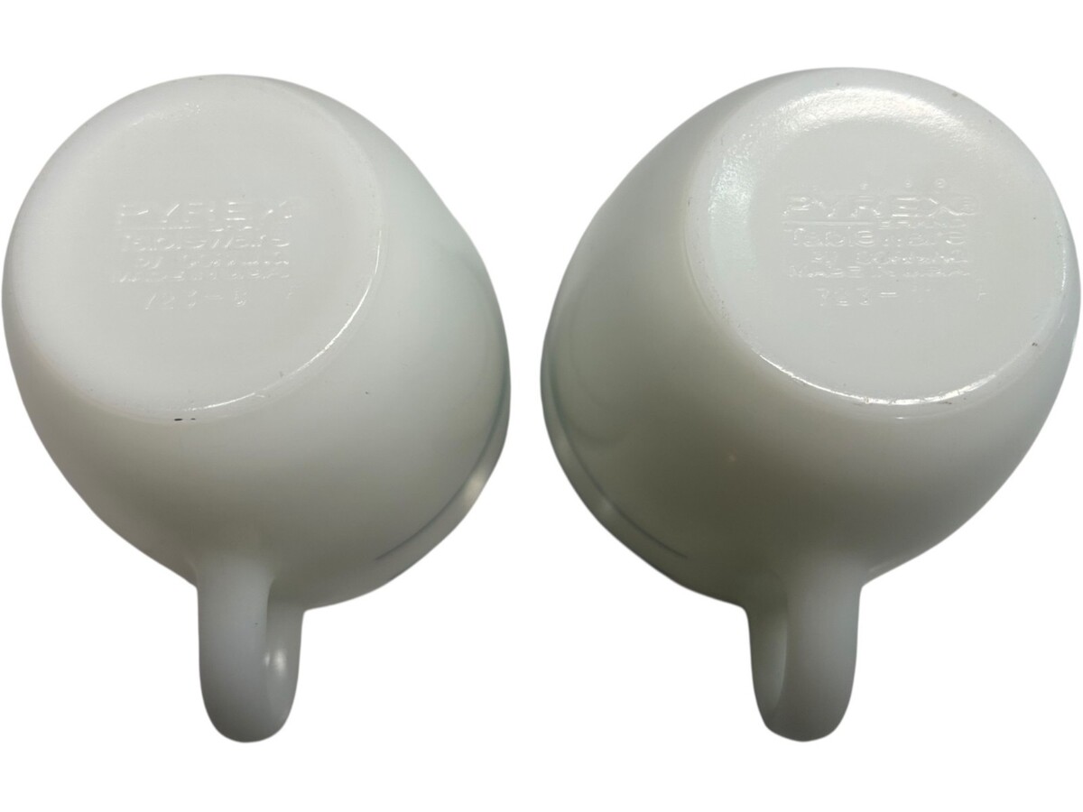 2 cups are in excellent condition with no noticeable chips scuffs scratches or cracks. Pour missing design. Picture is in great condition, but does have slight staining on the base of the handle and some surface scuffs and scratches on the interior of the glass. Both are in excellent condition for their age.