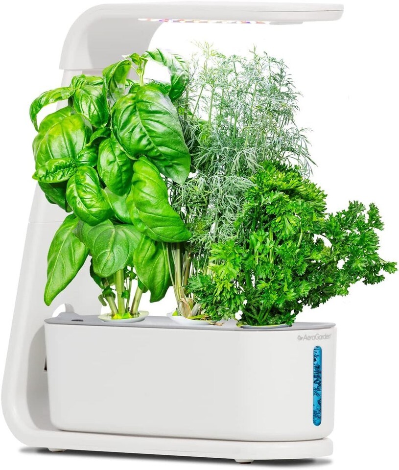 BRAND NEW DESIGN - Experience better plant growth from your AeroGarden Sprout indoor garden with a sleek modern look, new silent pump, and simple soft-touch button to control lights and reset plant food reminders PLANT TO PLATE - up to 3 plants can be grown at a time, up to 10" tall. Plants grow in water, not soil - an advanced indoor garden made simple HIGH EFFICIENCY LED LIGHTS - Our energy efficient full spectrum 10-watt LED grow lights tune to the specific needs of plants to maximize photosynthesis, resulting in rapid, natural growth and abundant harvests INCLUDES GOURMET HERB SEED KIT (3 POD) - Genovese Basil, Curly Parsley, and Dill a 3oz bottle of our patented, all natural plant nutrients (enough for a full season of growth) ALWAYS HOMEGROWN: FRESH. EASY. SAFE. - AeroGarden has been providing fresh, safe food options for over fifteen years and is the market leader for indoor hydroponic growing systems