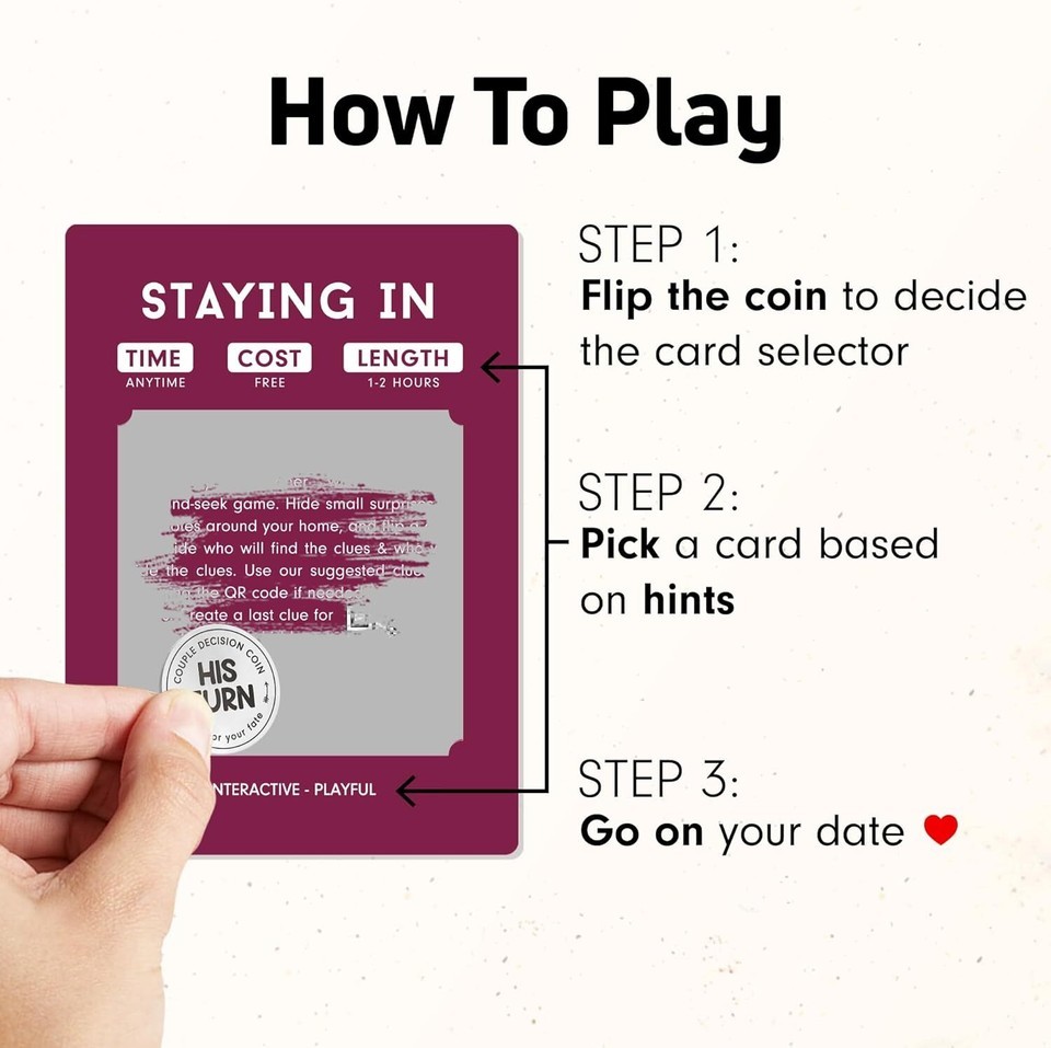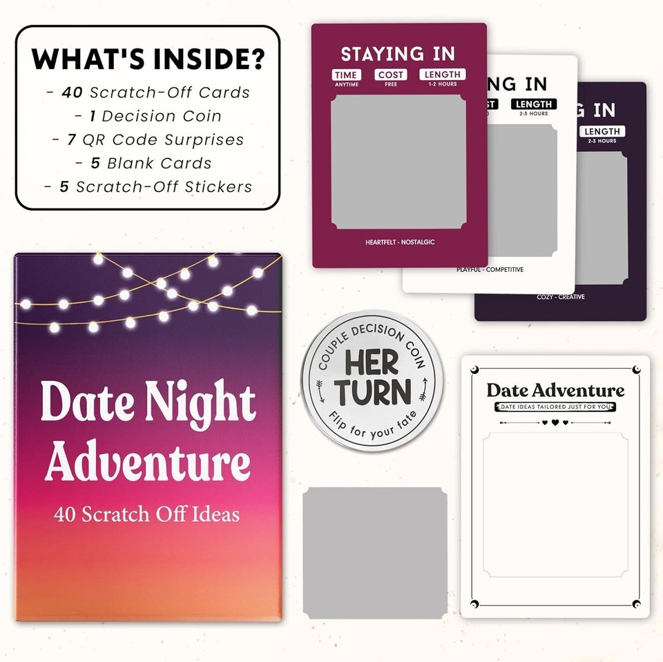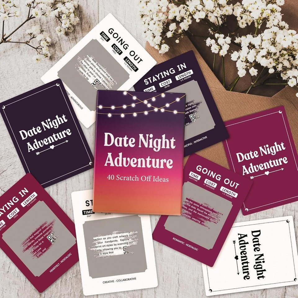 40 ADVENTUROUS DATES AWAIT: Embark on a romantic journey with couples gift ideas date night games, offering 40 unique adventures to turn ordinary dates into unforgettable experiences. Ideal couples card games for adults seeking thrilling dates, perfect date night cards for couples, wedding gifts, engagement gifts for couples, anniversary gifts for women, gifts for girlfriend, Christmas gifts for boyfriend, engagement gift, girlfriend gifts, bride gifts PERFECT TOOL TO RENEW LOVE: Say goodbye to monotony and embrace thrilling mystery dates that bring you closer, it's your secret weapon for renewed love and shared adventures. Thoughtful date night ideas couple games, gifts for wife, boyfriend Christmas gifts, boyfriend birthday gift ideas, birthday gifts for boyfriend, gift for girlfriend, Christmas gifts for her, bride to be gifts, Christmas gifts for him NO COMPLICATED RULES, JUST FUN!: Simple and clear ? scratch off the challenge card, and you MUST complete the adventure date. Each card provides useful clues, including the time of day, budget, length of the date, and whether it's intended for indoor or outdoor activities. Cute games for couples, date night games, couple games for date night, dating games for new couples, date night card games for couples HIDDEN DELIGHTS AWAIT: Enhance your date with an additional layer of excitement as you unveil hidden surprises through our ingenious QR codes. Grab your phone, and get ready to embark on an exhilarating journey of mystery and exploration. Meaningful wedding gifts for newlyweds, birthday gifts for girlfriend, birthday gifts for husband, gifts for him husband, romantic decorations special night PERFECT COUPLE THINGS FOR EVERY OCCASION: Excellent for various occasions: gifts for him or her, Valentine's Day, anniversaries, and more! Lovely bf gifts, girlfriend birthday gifts, gifts for him boyfriend, husband gifts from wife, family gifts ideas, wife gifts from husband