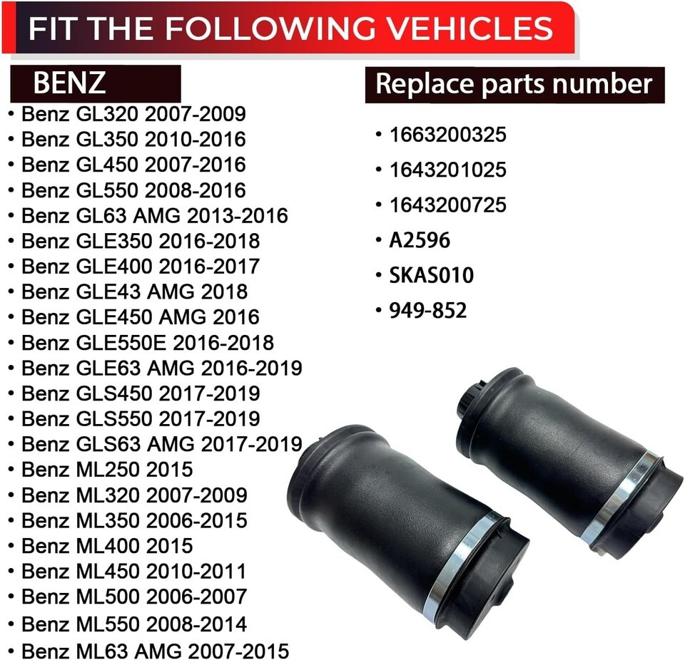 [OEM Part Number] Replaces 1643200225, 1643200425, 1643200625, 1643200725, 1643200825, 1643200925, 1643201025, 1663200325, 1663200625, A2596, SKAS010, 949-852 [Vehicle Fitment] Compatible with 2007-2017 Mercedes-Benz GL320, GL350, GL450, GL550, GL63 AMG, GLS450, GLS550, GLS63 AMG (X164/X166 W/ Airmatic); Compatible with Mercedes-Benz 2006-2019 GLE350, GLE400, GLE550E, GLE63 AMG, ML250, ML320, ML350, ML400, ML450, ML500, ML550, ML63 AMG (W164/W166 W/ Airmatic). For more information, please see the fitment table [High quality and Durability] NITOYO Air Suspension Spring Bags are made of tough natural rubber as raw material, which is resistant to high temperature and humidity, and not easy to be damaged. Meanwhile, they strictly conform to OEM specifications and are 100% tested before leaving the factory for superior performance and long service life [Efficient Performance] NITOYO Rear Air Suspension Spring Bag can effectively absorb the bumps and vibrations on the road, improve vehicle performance, reduce the up and down of the car, and make the ride smoother [Choosing the Right Part] Before buying, research to make sure the part fits your vehicle; enter all vehicle information (year, make, model, engine, and interior) to ensure compatibility, and check the qualifying instructions and that a professional installation is recommended