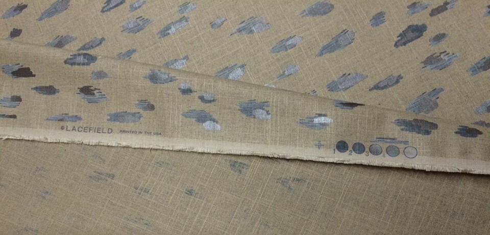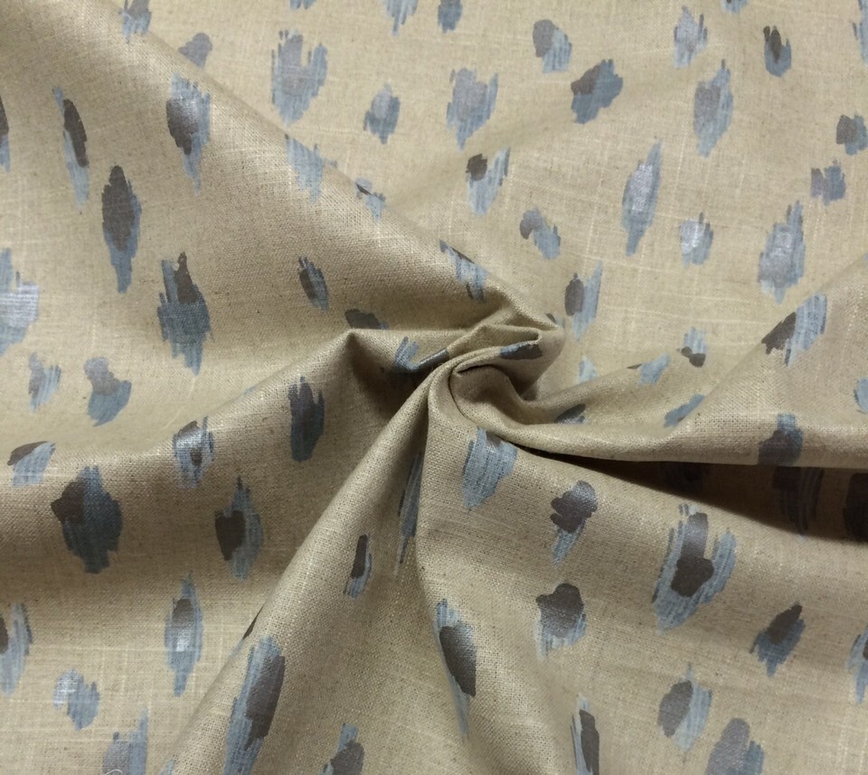 THE PAINTERLY STROKES OF ICE BLUE SHIMMER WITH SPOTS OF METALLIC TAUPE AGAINST A WARM NATURAL GROUND, PRINTED ON WEIGHTY LINEN-RAYON BLEND WITH A SMOOTH HAND