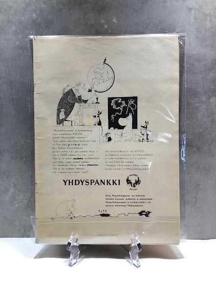 During the 1950's Tove Jansson's cartoon character Moomin (Moomintroll) was used to advertise Yhdyspankki (Union Bank of Finland). Tove illustrated the ADs by herself.