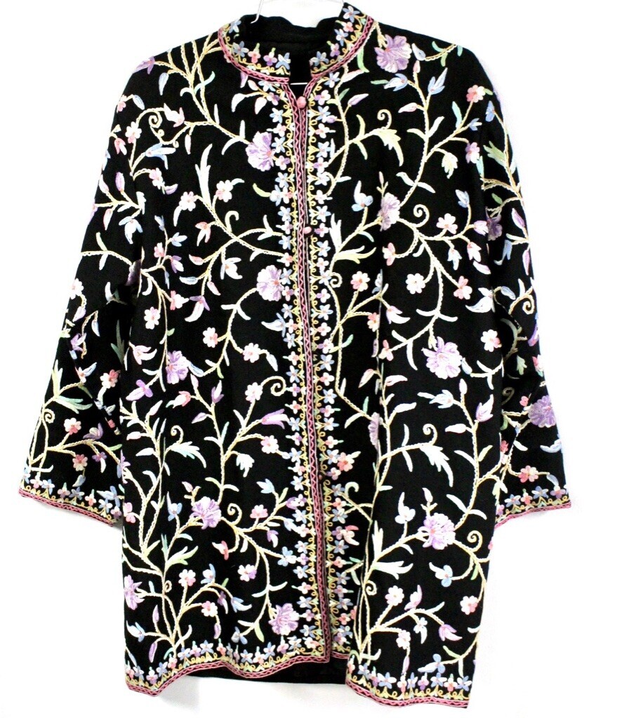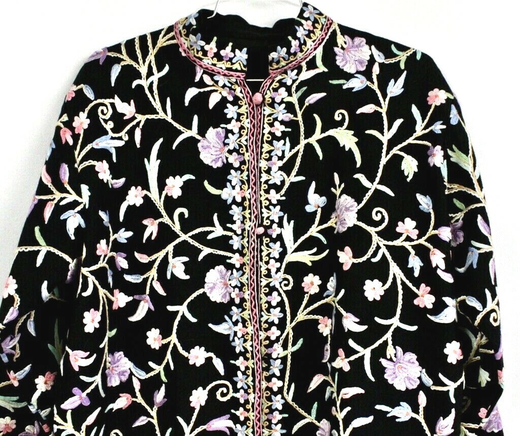 Vintage Wool Embroidered Chinese Floral Coat Nehru Collar Yarn Buttons L XL