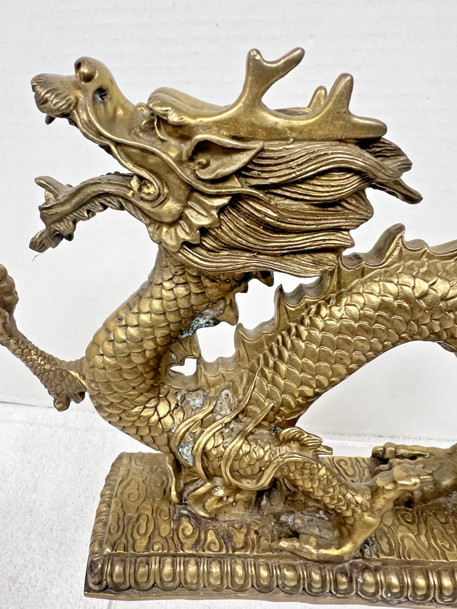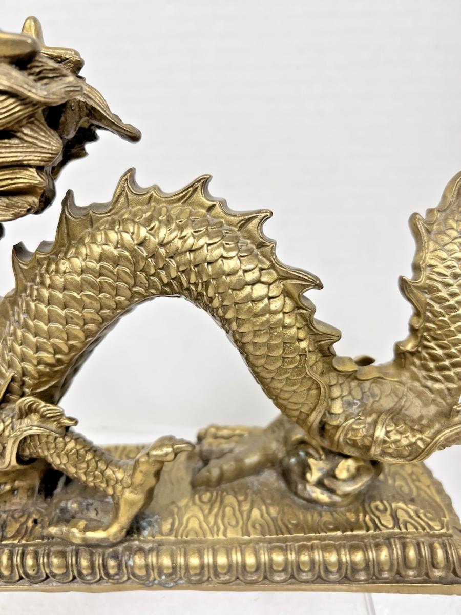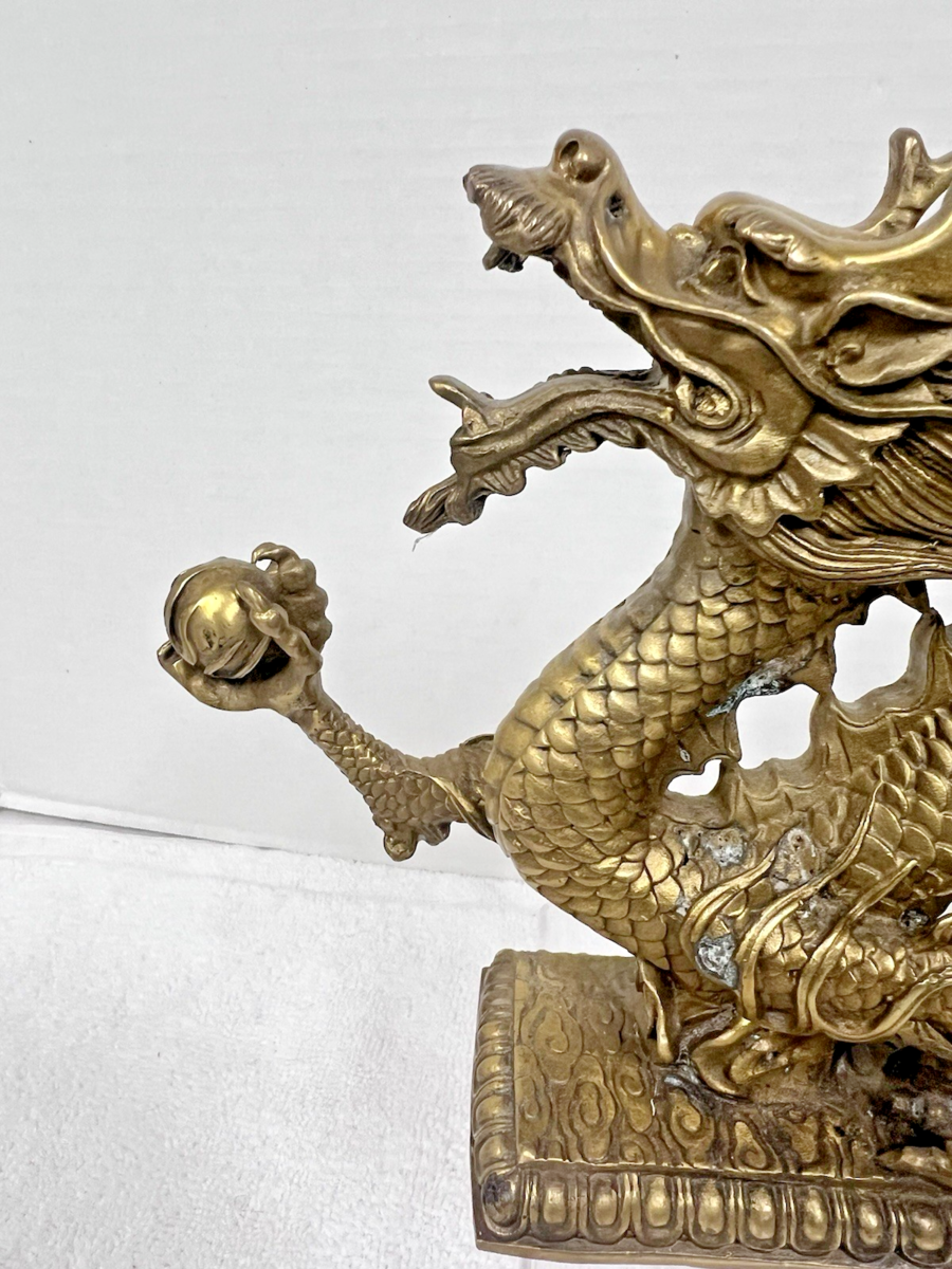 Vintage Cast Brass Detailed Dragon w Ball In Claw 13" Long x 7 " Tall Very Detailed it has a few whitish spots but no breaks or holes there is oddly a small bit of something that rattles in the base when you move it? The weight of just the dragon is just shy of 4 pounds we will box with care!