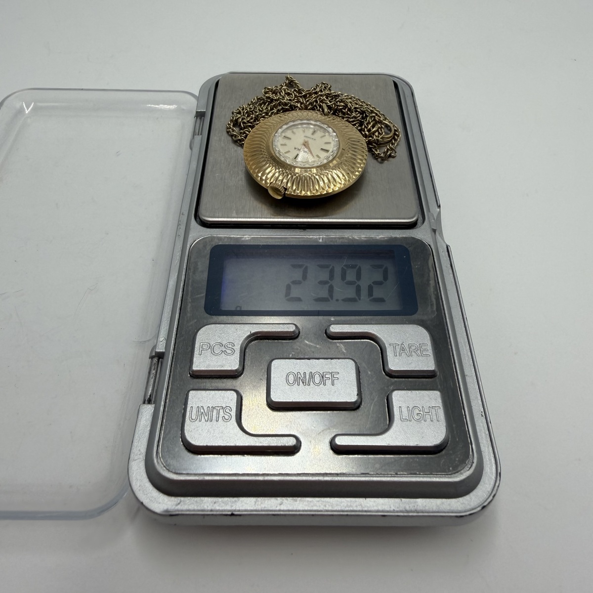 This elegant mechanical watch is designed as a pendant on a chain and features gold-tone (AU) gilding with a refined textured case.