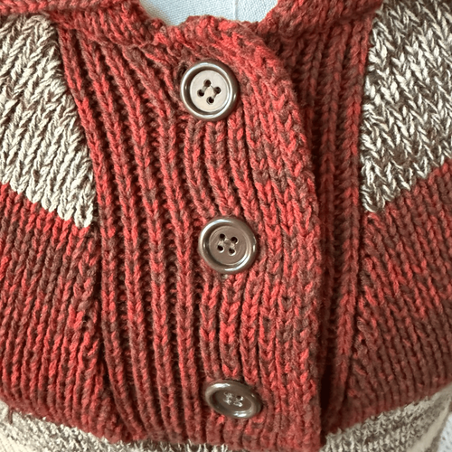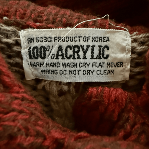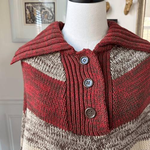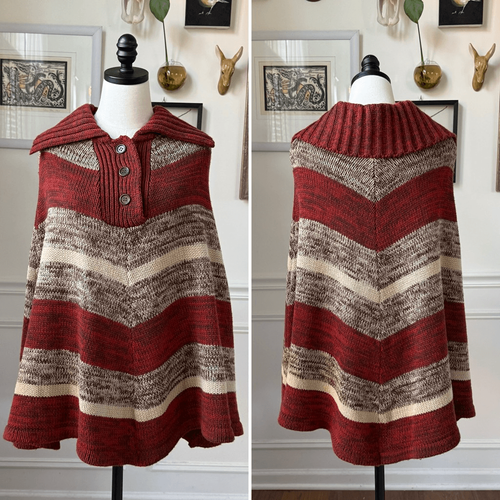 Vintage 70s sweater poncho in a very autumn/Thanksgiving color, palette of burnt orange brown and beige with a widespread collar and three button Henley placket. The tag inside says product of Korea 100% acrylic and it is a one size fits most item. It?s featured on my size medium dress form for scale. There are no arm holes. Laying flat measures 31 inches from the top of the back collar to the center front and approximately 22 inches wide, where the bust would be. It?s hard to do a true bust measurement without arm holes.