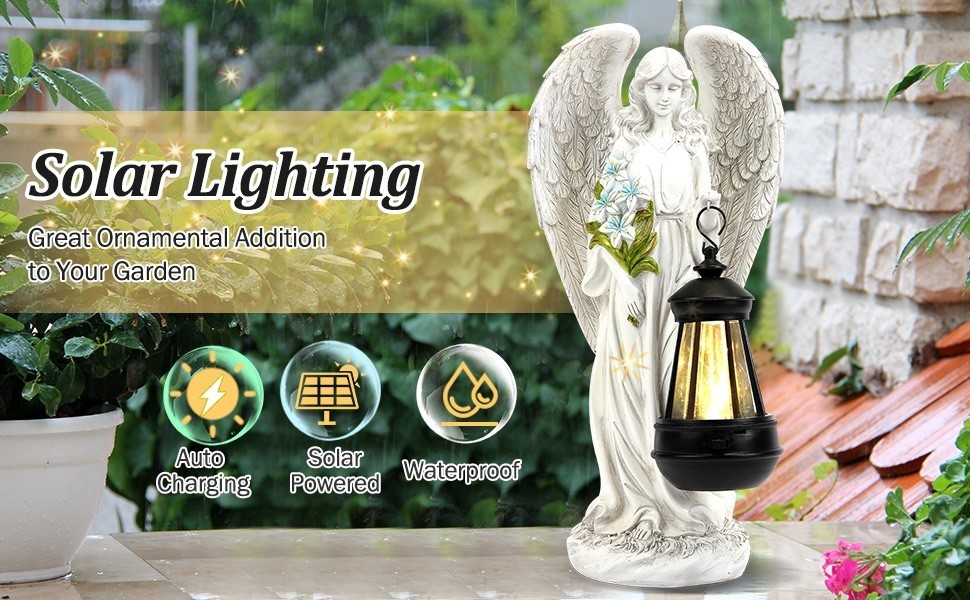 For years, angels have served as comforting, celestial beings that watch over, protect and heal. Their warmth brings solace and consoles. As a delightful garden accent, a walkway accent, a charming patio addition or as a memorial marker for a friend, family member or pet, our solar angel yard statue is a memorable, conversation-starting angelic presence. This solar angel yard statuary features an intricately detailed angel holding a solar lantern to light up your garden, wrapped in the comfort of its wings.