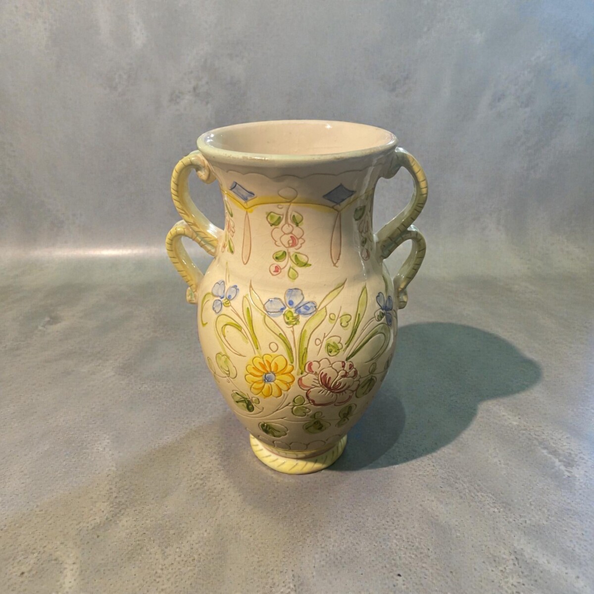 The double handled form and hand-painted floral motif give it that classic mid-20th century Italian art pottery feel collectors and decor lovers appreciate.