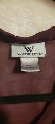 The Worthington Ruffled V-Neck Long Sleeve Polyester Blouse in burgundy is a stylish and versatile top perfect for casual occasions. This blouse features a flattering V-neckline with a ruffled front, long sleeves, and a button closure. Made of machine washable polyester, it is designed for regular fit and comfort. The burgundy color adds a pop of vibrancy to your wardrobe, while the designer touch adds a touch of elegance to your outfit. Perfect for wearing in the summer, fall, or spring seasons, this blouse is a must-have for any fashion-forward woman.