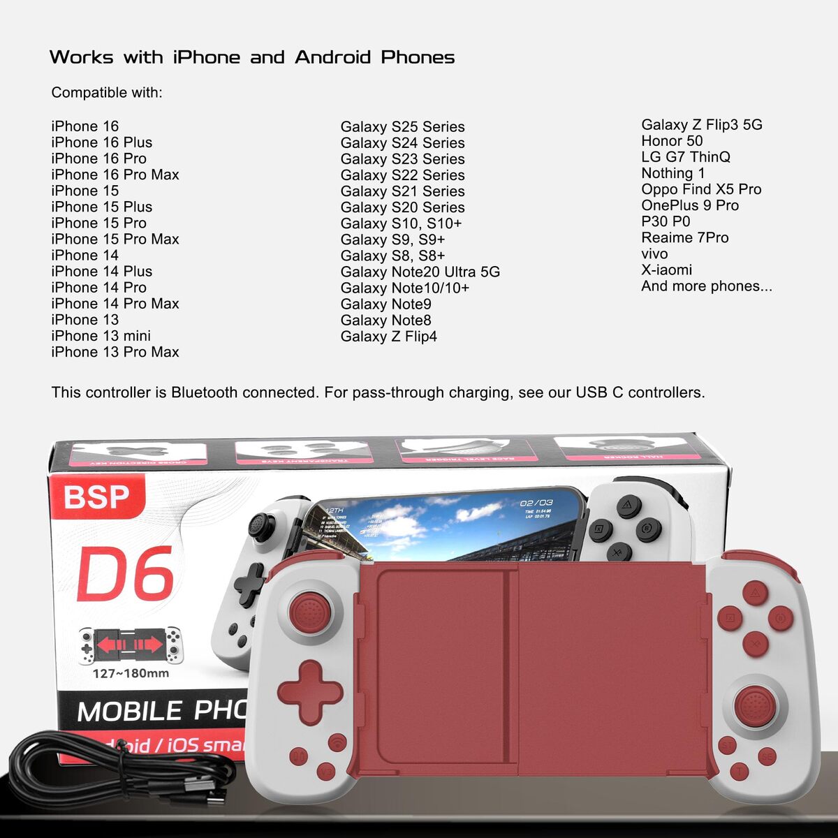 Universal Compatibility: The phone gaming controller works seamlessly with iPhone Android phones, including iOS 15+/Android 10+; Completely suitable for the full range of iPhone 16/15/14/13 and so on; Bluetooth controller for android is compatible with Galaxy S series, Galaxy A series more Android smartphones,Multi-Platform Support: Play any controller supported APP games, and the controller for iPhone Android is designed to enjoy unstoppable gaming experience, support nearly all cloud gaming services including Game Pass, PS Remote Play, Steam Link, GeForce NOW, MFi Arcade hundreds of popular mobile games like Call of Duty, Roblox, Fortnite, etc.,Wireless Controller for iPhone with Hall Joystick: The Hall effect joystick provide ultra precise control, No drift; It helps you gain dominant position of games faster and the performance and game experience has been improved qualitatively,Adjustable Turbo Speed Stable Wireless Connection: The gamepad joystick with manual auto Turbo (3 levels of turbo speed), you can adjust the speed according to your need for the ultimate mobile gaming experience; This wireless game controller adopts Bluetooth 5.0 connection technology, stable connection, low latency,Stretchable Design Support Phone Case: The scalability of controller for phone allows you to install a 127-180 mm cellphone, don't have to remove your phone case every time; The game controller has clips on the left, right and bottom of the controller to securely hold the phone and prevent it from tilting and slipping,Tips for Cloud Gaming Controller: Please use this mobile gaming controller to play games on a high-speed and stable network, because the cloud games is more demanding on the network, high-speed low-latency network environment is needed to reduce the delay caused by network congestion and enhance the gaming experience,Long Battery Life: This wireless controller built-in 600mAh high-performance rechargeable battery and it can be fully charged within 2-3 hours, allowing you can enjoy games longer without interruption