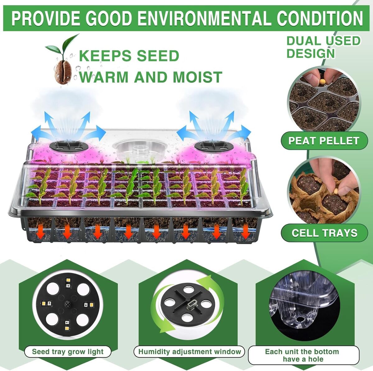 Seed Starter Trays with Grow Lights: The seed starting trays can be completed mechanically in the filling, sowing, and germination. The operation is simple and fast. It allows plants to be better cared for during germination and growth, keeping plants in the best-growing environment for rapid, natural growth and abundant harvests.,Seed Trays with Smart Controller: 4 brightness settings to meet each plant's lighting requirements at different stages, 4 cycle timing settings (4/8/12/18H) will automatically turn on and off at the same time the next day, no need to unplug/re-plug. It will take good care of your plants while you are at work or on vacation, easy and convenient.,Professional Seedling Grow Light Tray: Each seed starter tray has 8 LED grow lights. They are embedded in the bottom of the humidity control window. Full spectrum light just like natural sunlight. Greatly promotes indoor growth as it accelerates photosynthesis, ideal for all stages of growth and a variety of plants.,Adjustable Humidity Design: Our seed trays are made of plastic with a PVC clear cover. Each cover is equipped with 8 vents, which can easily adjust the inner humidity and temperature by rotating the regulator to accommodate different stages of seed-to-seedling growth, promote air circulation and help seed growth. The adjustable window lets you can adjust the inner humidity from 50%-100% to meet your needs.,Wide Range of Applications: The seed starter kit with grow light is an excellent choice for seed germination of flowers, herbs, fruits, vegetables, etc. The humidity of the environment, the intensity, and the cycle of the grow lights can all be manually controlled. The intelligent control system increases the survival rate of seedlings and cuttings. It is an ideal gift for gardening lovers.