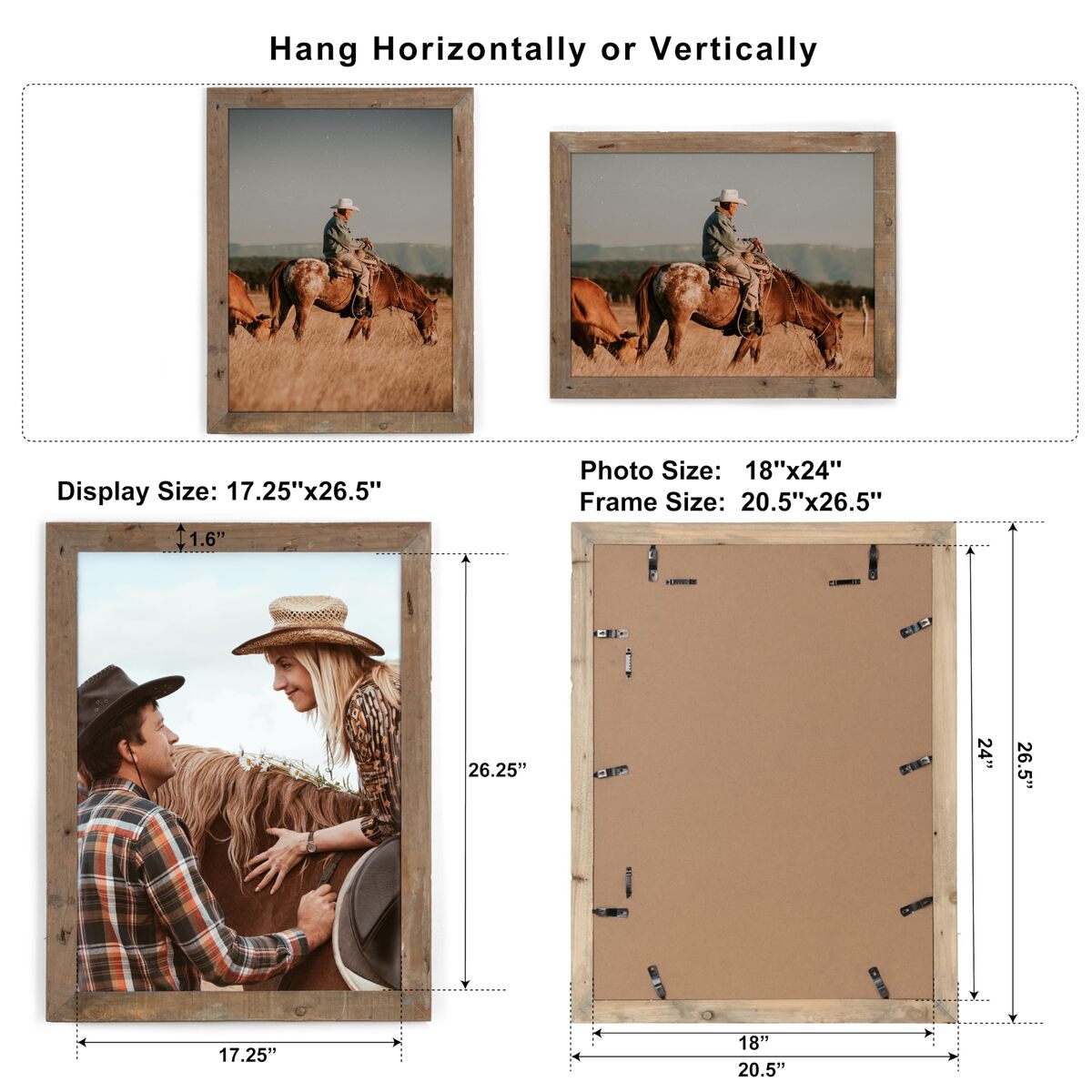 Rustic Charm for Your Memories: Display your cherished moments with our 100% reclaimed wood picture frames. Each 18'' x 24'' frame has a unique weathered gray painting and natural nail holes, adding a touch of rustic charm to any decor,Safe and Sturdy Tempered Glass: Unlike traditional glass, our picture frames feature high-quality tempered glass that is safe and durable. Perfect for any rooms, the tempered glass shatters into harmless granules if broken,Ready to Hang Anywhere: Our 5x7 picture frames come fully assembled and are ready to display your memories right out of the box. The 1 3/4 inch wide reclaimed wood moulding and clean lines complement any room and decor. With simple vintage style, the photo frame can be standing in the desktop display your photos, also can handing on the wall. It's very easy to install. Great tabletop wall decor,Create Your Perfect Gallery: Our 18 by 24 picture frames are not just for pictures, but also for displaying art prints, diplomas, certificates, and more. Pair multiple frames to create your own unique gallery, or give as a thoughtful gift for any special occasion,Protective Packaging: We developed exclusive proprietary packaging that helps ensure safe delivery of fragile items; order with confidence, click and today!