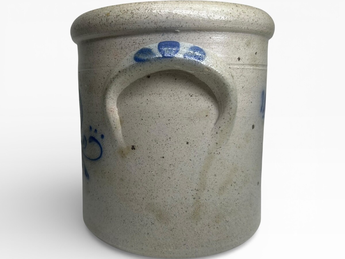 Up for sale is a beautiful, authentic piece of Rockdale Union Stoneware from Cambridge, Wisconsin. This hand-thrown crock features the classic "salt-glaze" finish with a distinct orange-peel texture and a deep cobalt blue hand-painted floral motif.