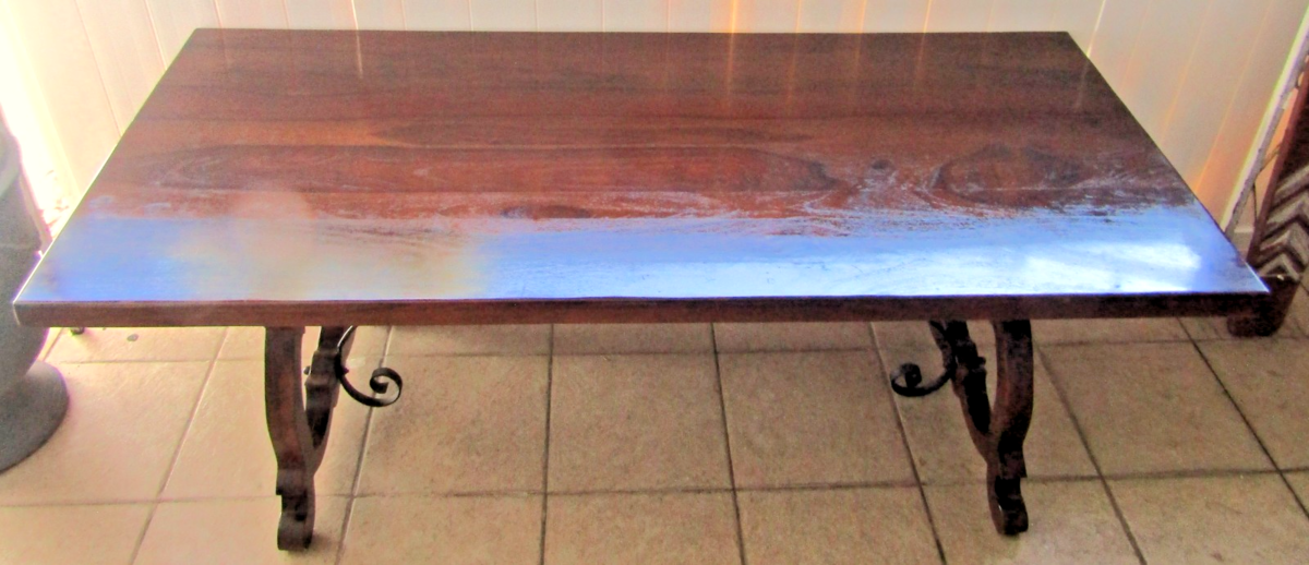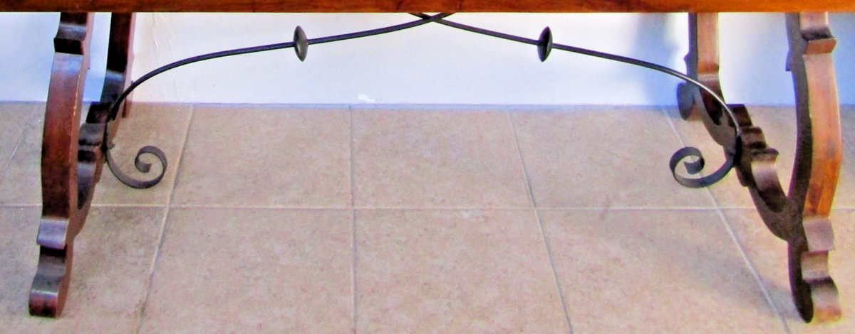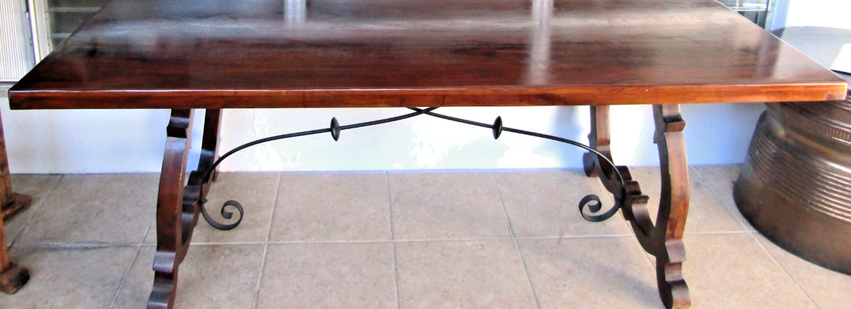 Vintage Spanish Catalan Trestle Dining Table with Lyre Legs and Cast Iron Stretchers