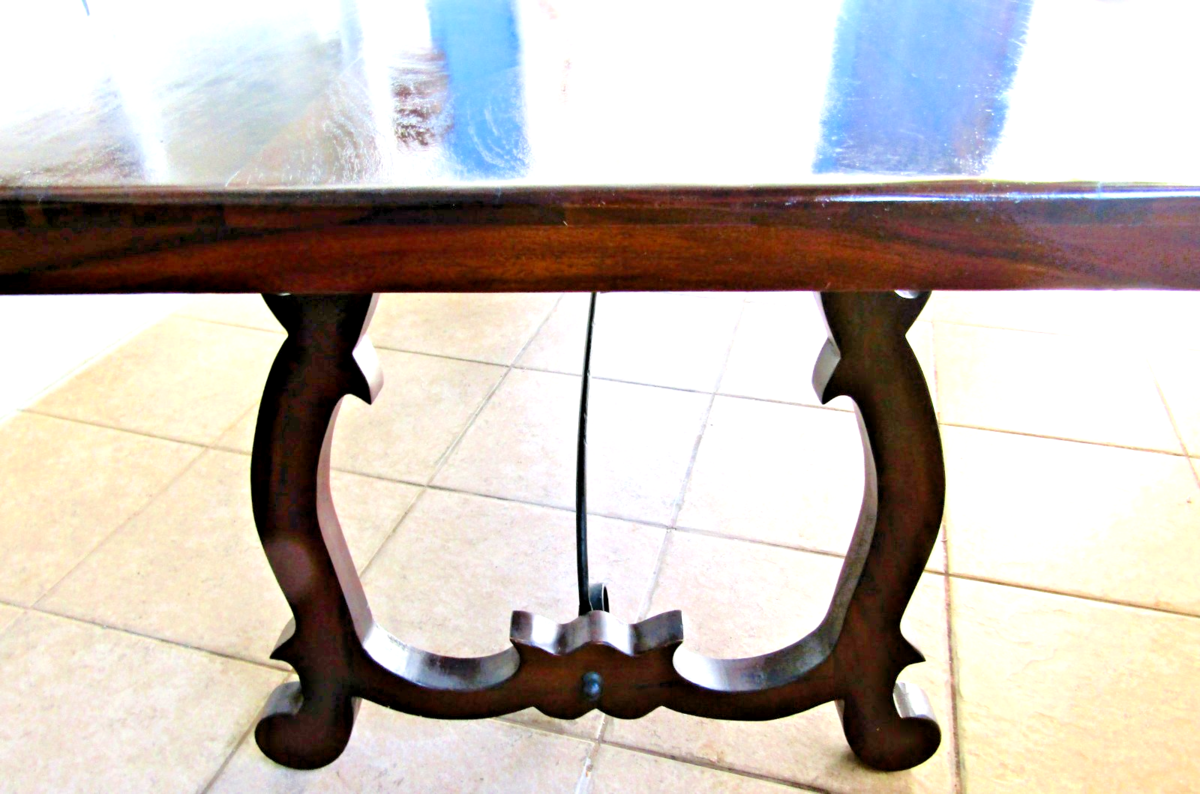 Vintage Spanish Catalan Trestle Dining Table with Lyre Legs and Iron Stretchers