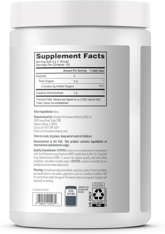 ISOPURE Creatine Monohydrate is a clean, single-ingredient supplement formulated to support cellular energy production and muscle recovery after exercise.* With no fillers, flavors, colors, sugars, or sweeteners, this unflavored creatine powder delivers exactly what you want?nothing more, nothing less.