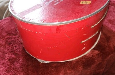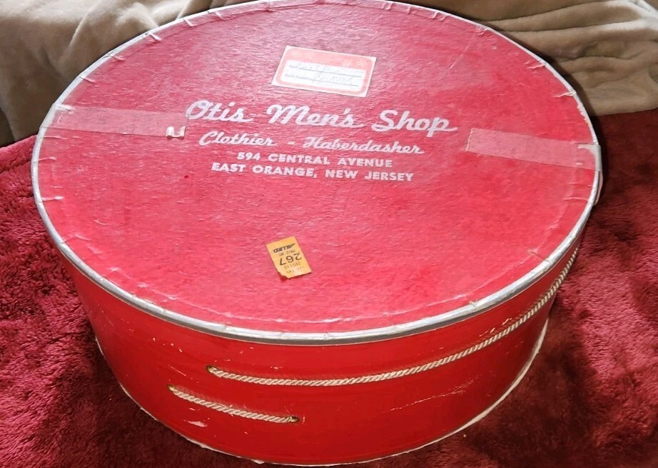 Vintage hat box from Otis Mens Shop. East Orange NJ. Bottom is loose from the top. Has some wear issues from age. Neat collectible. Classic hat box. Oval shape.