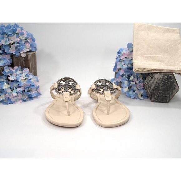 Tory Burch Miller New Cream Pave Crystal Logo Leather Flat Sandals 8.5