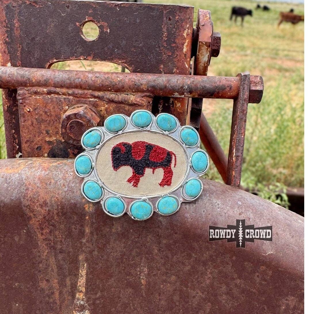 Make a bold statement with the Blazing Buffalo Scarf Slide. Featuring an embroidered buffalo centerpiece framed by 12 vibrant turquoise beads and set in polished silver, this piece blends rich Western tradition with rugged style that commands attention.