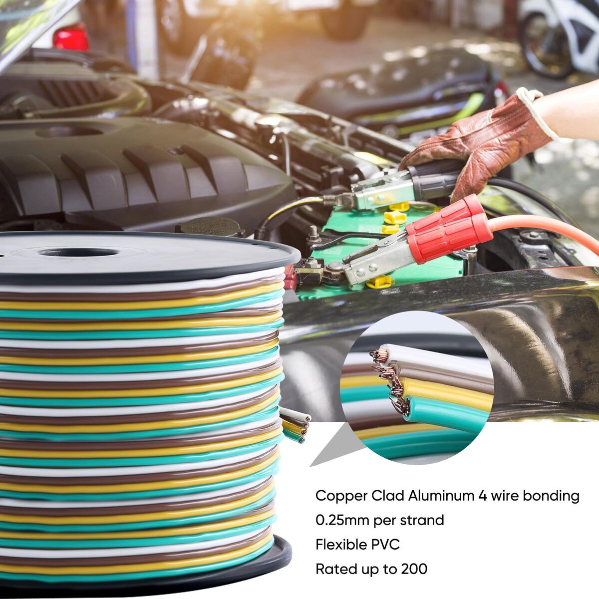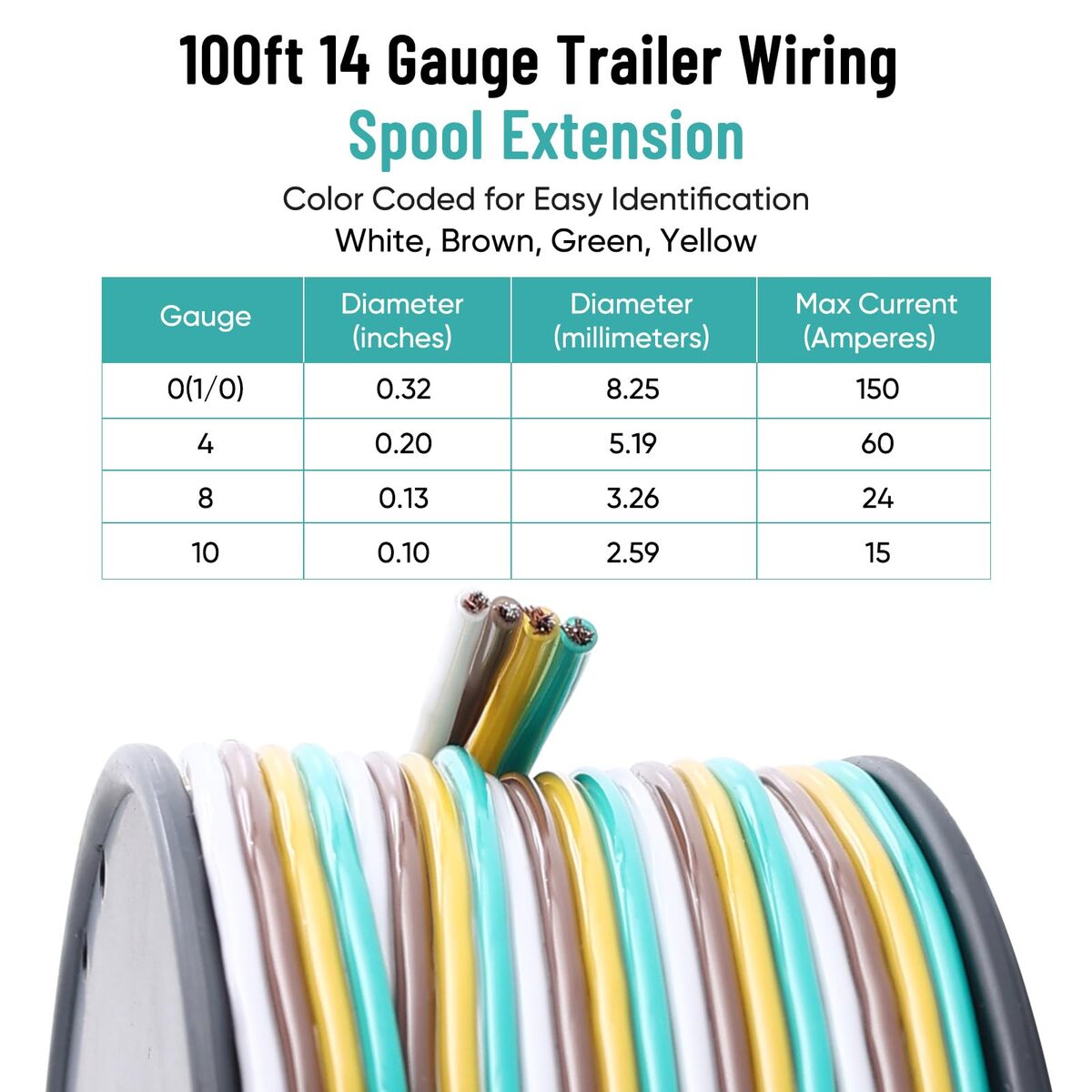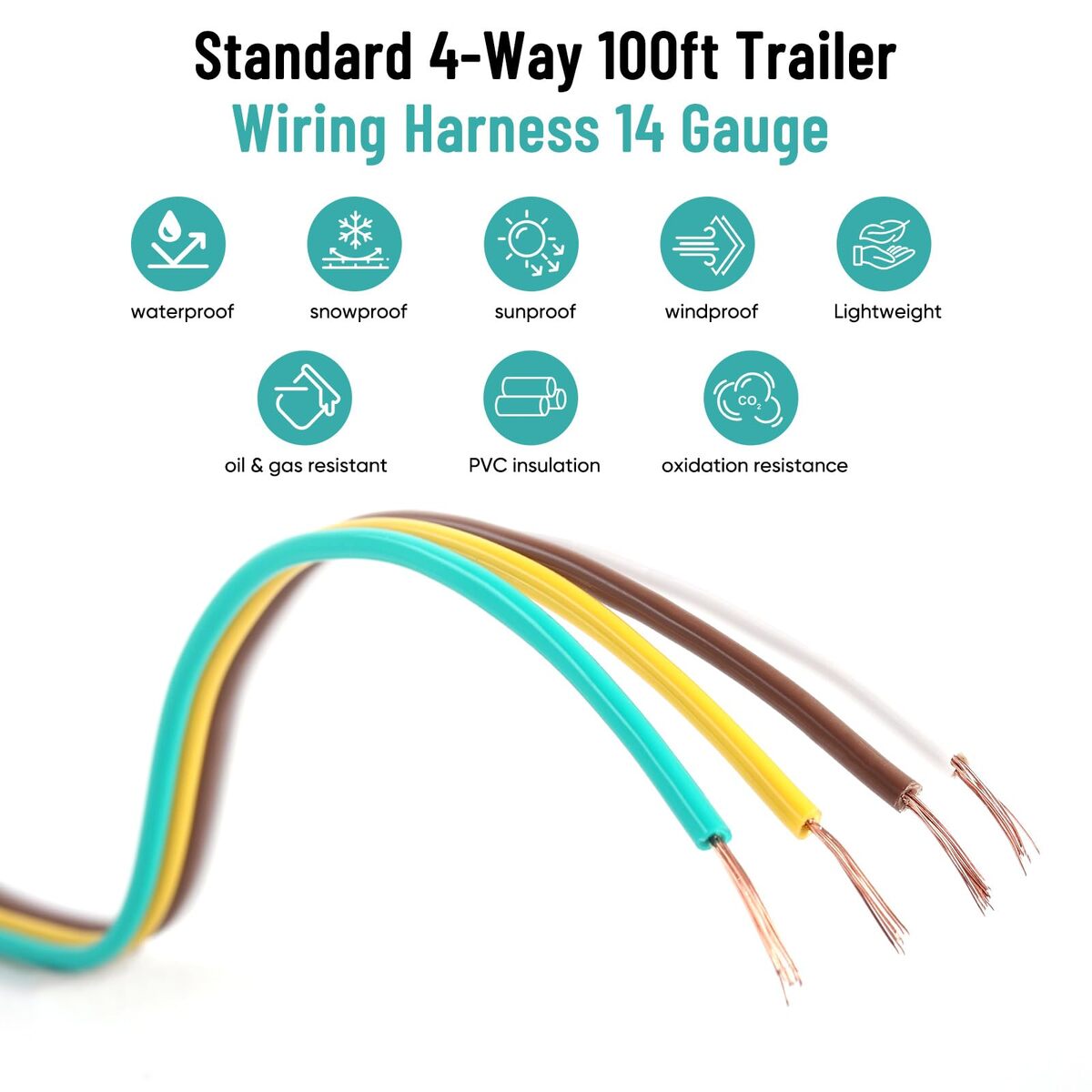 100FT Trailer Wiring Harness Kit: 4 equal length (100ft) wires in green, yellow, brown and white combined to form a parallel multi-conductor cable that can be used with 4-way flat or round plugs and sockets,Copper Clad Aluminum 4-Conductor Stranded Wiring: 14-gauge flat trailer wire with premium CCA combines the benefits of aluminum with the conductivity of copper. heavy-duty construction ensures reliable performance in any towing application. trailer wiring 4 pin,Trailer Wiring Kit Adequate Length: 4-wire trailer harness provides adequate cable length for trailer wiring replacement; spools can be split into individual wires for use; meets SAE J1128 standards for driver safety,Boat Trailer Wiring Harness: Standard 4-way 100ft trailer harness, 14 AWG color coding allows for quick identification and easy installation, White wire: ground. Brown wire: tail light, yellow wire: left turn signal, green wire: right turn signal,Trailer Wiring Harness Kit 4 Pin: 4-pin 4-way bonded flat trailer wiring harness is widely compatible with your trailer, RV, camper, boat trailer, motorcycle, ATV trailer and any 12V application, perfect for all your basic wiring needs