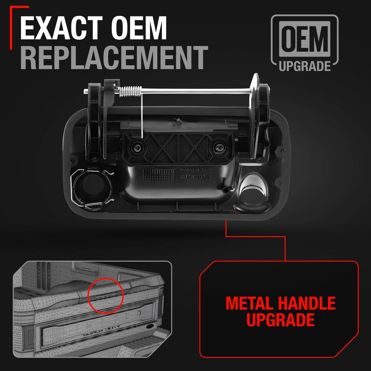 DIRECT OEM REPLACEMENT: Perfectly matches OEM part numbers 8L3Z-9943400-AC, 81076, FO1915124 ensuring a precise fit and exceptional functionality for your vehicle's tailgates with a rear camera.,COMPATIBLE WITH: 2004-2014 Ford F-150, 2004 Ford F-150 Heritage, 2008-2009 Ford F-250 (Mexico), 2008-2016 Ford F-250 Super Duty, 2008-2016 Ford F-350 (Mexico), 2008-2016 Ford F-350 Super Duty, 2008-2016 Ford F-450 Super Duty, 2010-2016 Ford F-550 Super Duty, 2004-2015 Ford Lobo (Mexico), 2007-2009 Ford Explorer Sport Trac, 2006-2008 Lincoln Mark LT, 2010-2012 Lincoln Mark LT (Mexico), this tailgate handle integrates seamlessly with vehicles equipped with tailgate cameras.,DURABLE MATERIALS: Made from robust plastic and upgraded metal lever, this handle is crafted to withstand regular use and maintain its textured black finish over time.,EASE OF INSTALLATION: Engineered for easy installation, this tailgate handle allows for a quick and straightforward replacement process.,AMERICAN OWNED OPERATED: Proudly American owned and operated in Detroit, MI, providing exceptional US-based customer support for your peace of mind.