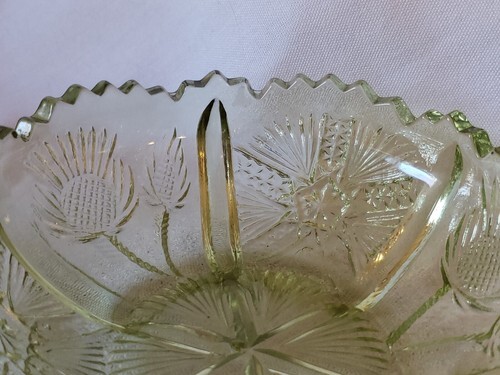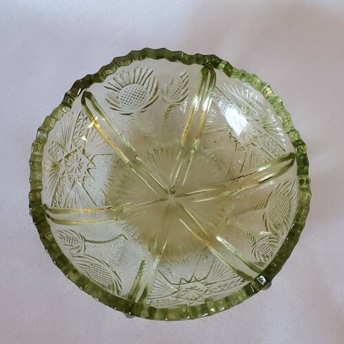 Vtg Thistle & Bee Green Glass Candy Dish Nut Bowl Antique Sawtooth Brilliant Cut