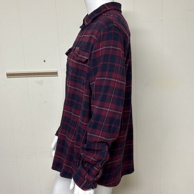 Burgundy red and blue plaid, long sleeves, button front, button-flap chest pockets, logo patch on left pocket, button cuff, and side seam hand-warmer pockets