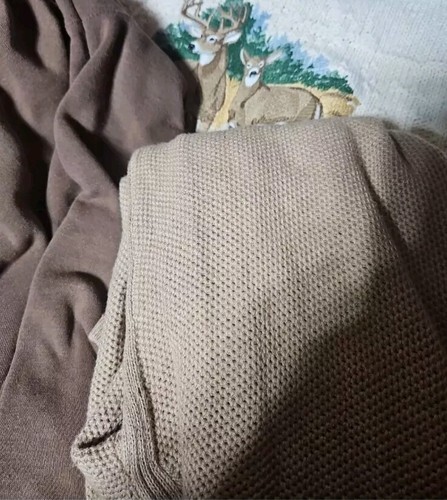Last photos show in LED lighting with camel hair, brown, and a deer caricature; dusk, natural light. Flat lay photos are with a flash.
