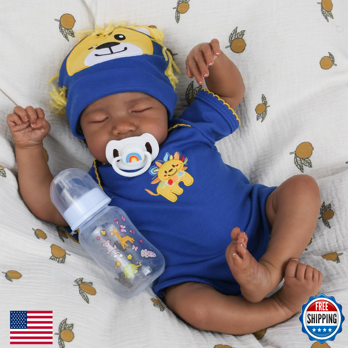 Lifelike African American Reborn Doll - This sleeping baby doll measures 18 inches from head to toe, made with high-quality vinyl and a soft cloth body. The vinyl limbs provide a realistic touch, while the cloth body adds a cuddly and huggable feel, making it ideal for playtime and display,Hand-Painted Realistic Features - This realistic reborn doll features hand-painted details, including adorable facial expressions, delicate eyelashes, and intricately designed lips. Its lifelike appearance will captivate both collectors and doll enthusiasts,Safe and Durable - Safety is our utmost priority, and we ensure that this doll is made from child-safe and non-toxic materials. Rest easy knowing that this lifelike baby doll meets the safety requirements of ASTM F963 and EN71 for ages 3+,Complete Gift Set - Your newborn baby doll comes with everything you need for hours of playtime fun! It comes with a complete package that includes a nursing bottle, a magnetic pacifier, a birth certificate, a lovely blue onesie, a matched hat, a diaper and a gift box,Perfect Gift Choice: Whether you're a collector, a doll enthusiast, or looking for a special gift, this black reborn baby boy is a wonderful choice. Its lifelike features and attention to detail make it a captivating and cherished item for both children and adults alike